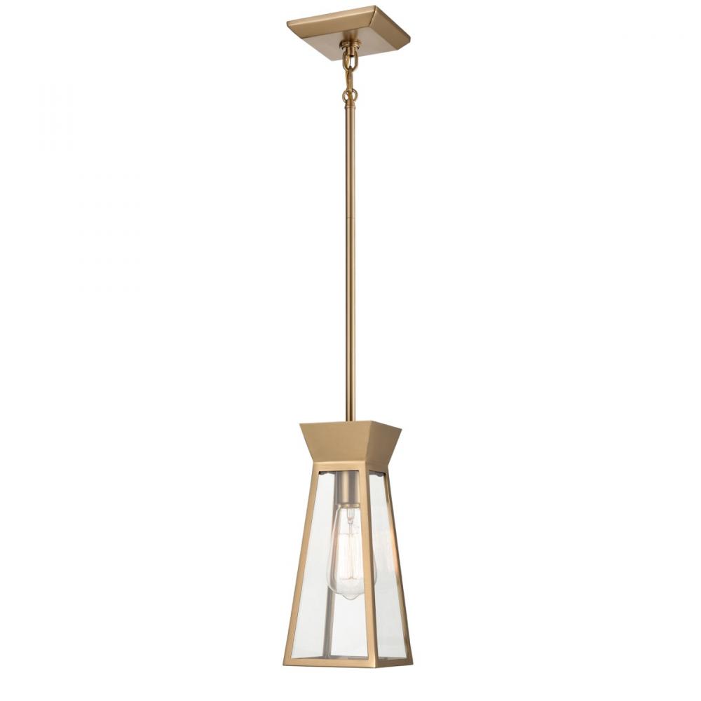 The Lucian collection, designed by Kevin Kraemer, is a modern twist on a classical lantern style light. Shown in a rich plated brushed brass (also available in black with brass accents). Clear panel glassware surrounding the bulb. The model shown is a single pendant which comes with extra rods for easy height adjustment and has a hangstraight to be compatible with sloped ceilings.
