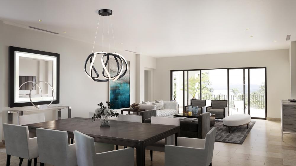 The Mira collection of pendants feature a truly unique designed frame. Suspended on height adjustable aircraft type cables, this LED pendant features a rich semi gloss black finish (These models are dimmable with appropriate LED rated dimmer switches).