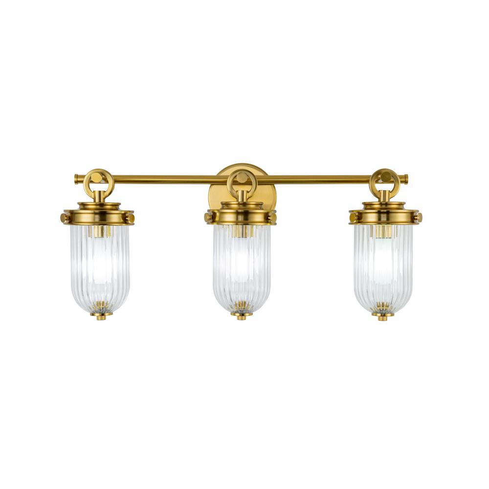 The Myla Collection 3 light wall sconce by Kevin Kraemer is a captivating blend of vintage charm and refined elegance, featuring a radiant brass frame that beautifully complements its clear ribbed glassware. The timeless design creates a warm and inviting glow, making it a stunning centerpiece in any setting. Perfectly crafted for those who appreciate classic sophistication with a modern touch. Great for any bathroom setting.