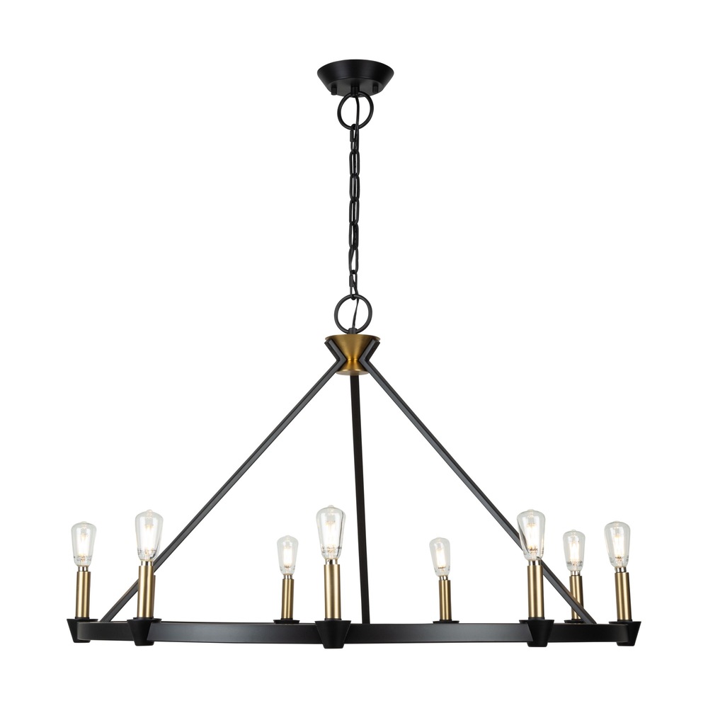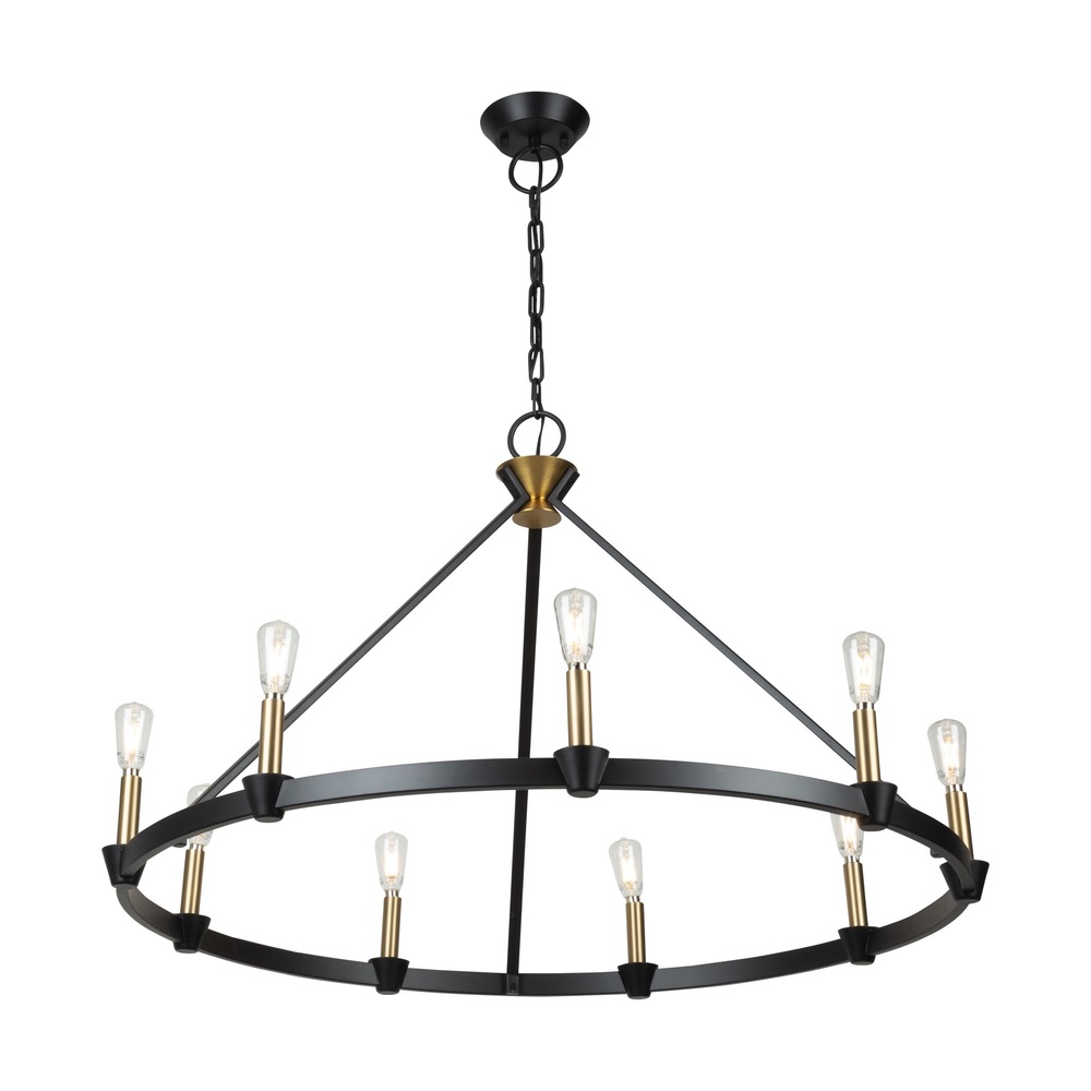 Created by designer Kevin Kraemer, the Notting Hill collection showcases a sophisticated design with black metal frames, exquisitely complemented by brass candle covers and accents. The combination of these finishes adds a touch of elegance and modernity to the collection, creating a visually striking and stylish visual. The use of specific elements highlights Kraemer's attention to detail and commitment to creating unique, contemporary pieces. The 9 light ring type chandelier is shown. (Height adjustable via chain)