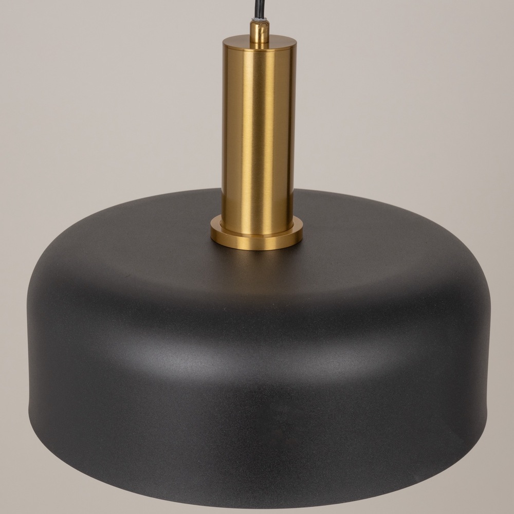 The Orsa collection pendant features a striking design, combining a sleek black metal shade with an elegant brass column. Its interior, characterized by a reflective surface, adds a touch of sophistication, creating a harmonious blend of modern aesthetics and timeless appeal.