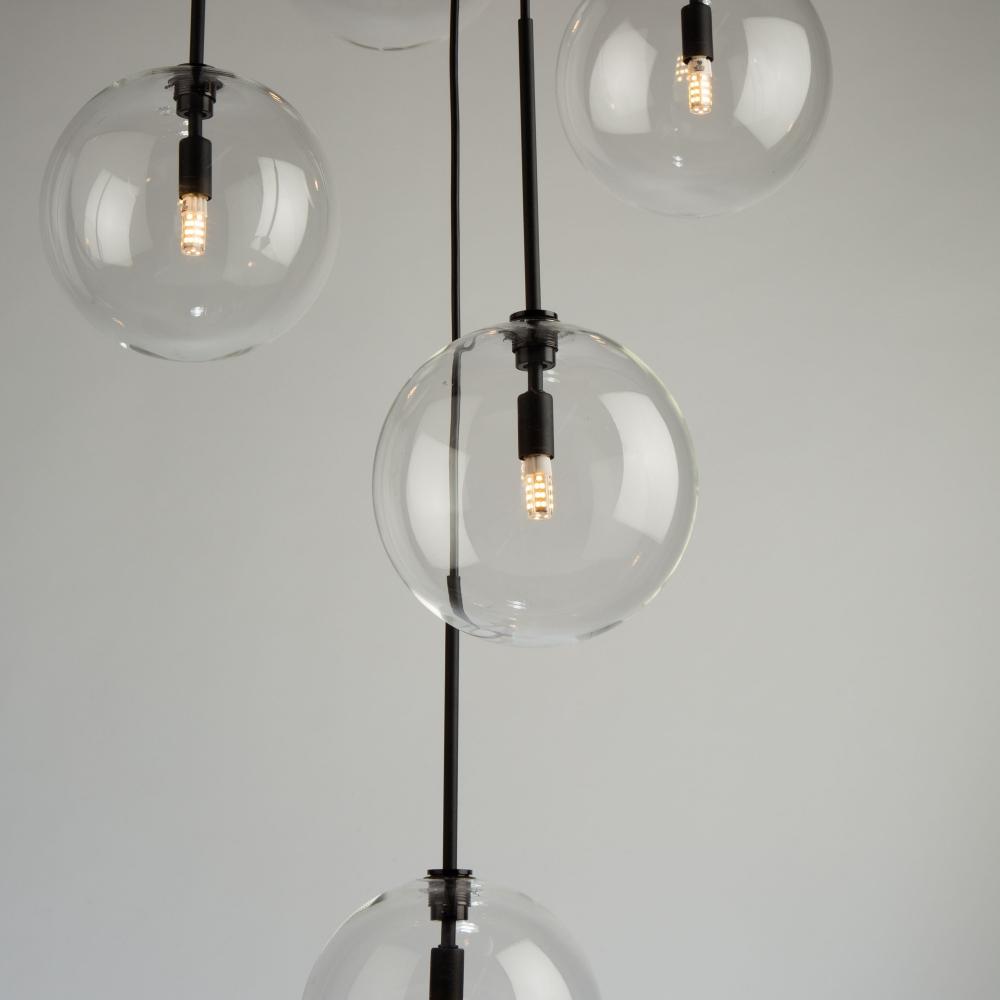From designer Steven Sabados of S&C, the Pinpoint collection hits that 'simple is more' trend. This series features floating clear glass sphere, textile wiring coverings, and is finished in a rich black. Sometimes simple is more!