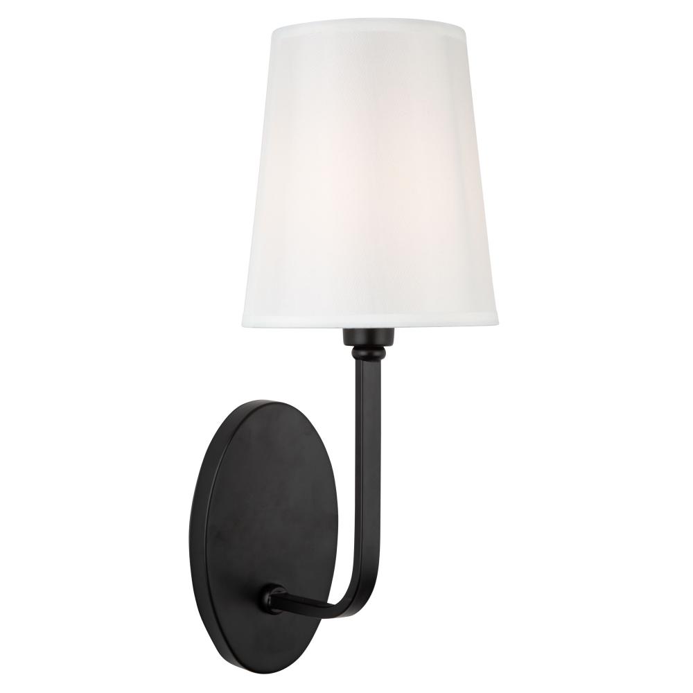 From the S&C design firm, with strict direction from Steven Sabados, the Rhythm Collection sconcefeatures a traditional type frame with flat tubular arms. The frame is finished in matte black and complimented with linen hardback white shades.