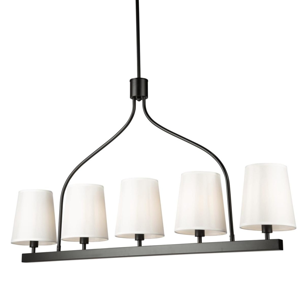 From the S&C design firm, with strict direction from Steven Sabados, the Rhythm Collection island lightfeatures a traditional type frame with flat tubular arms. The frame is finished in matte black and complimented with linen hardback white shades.