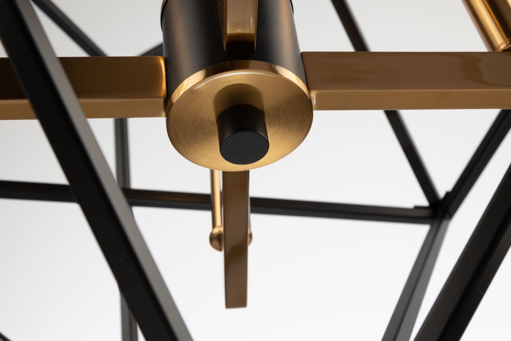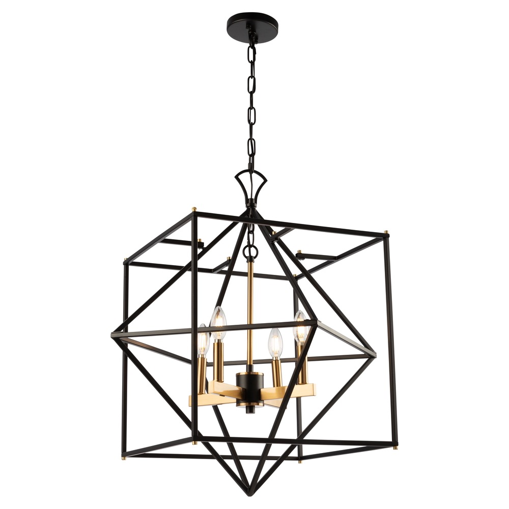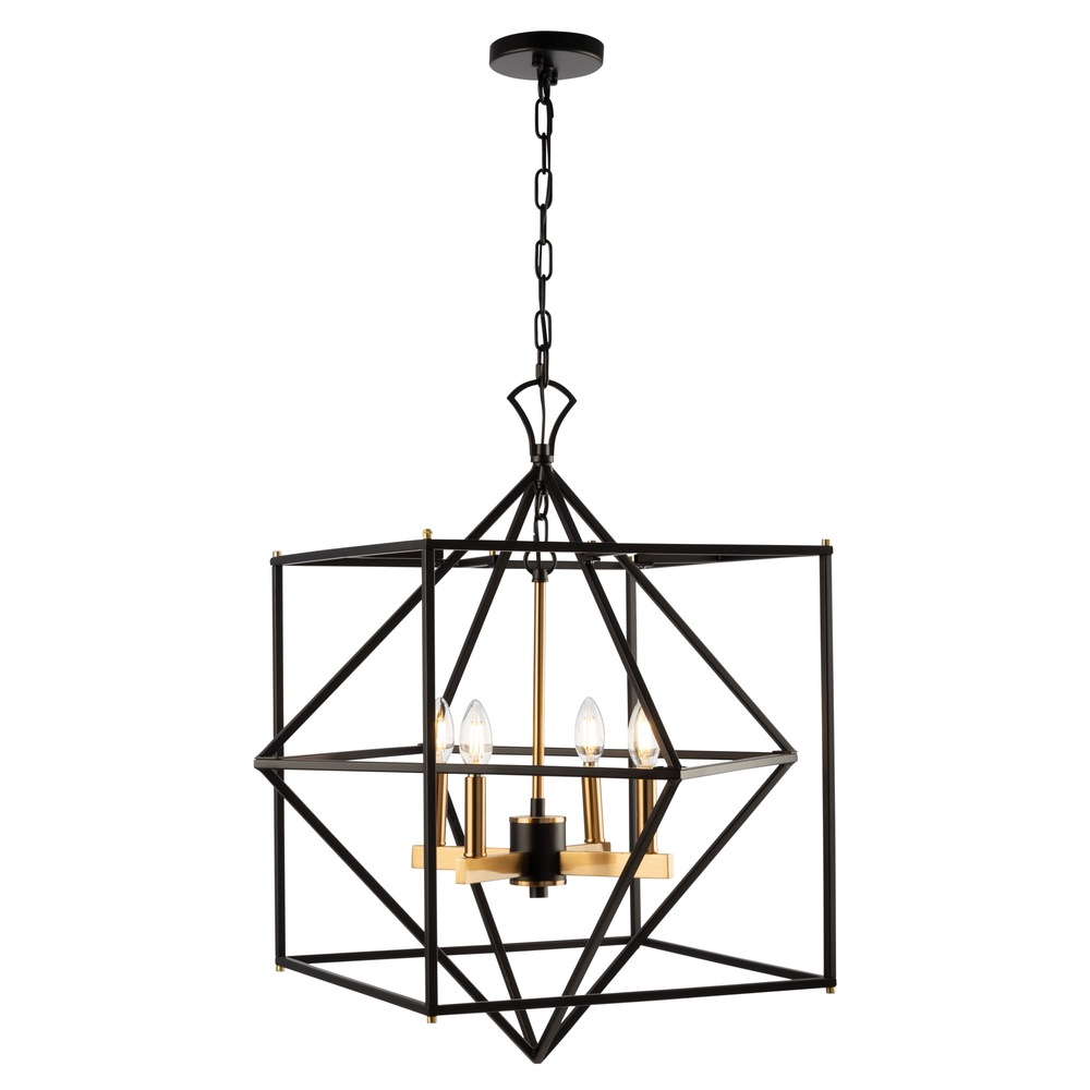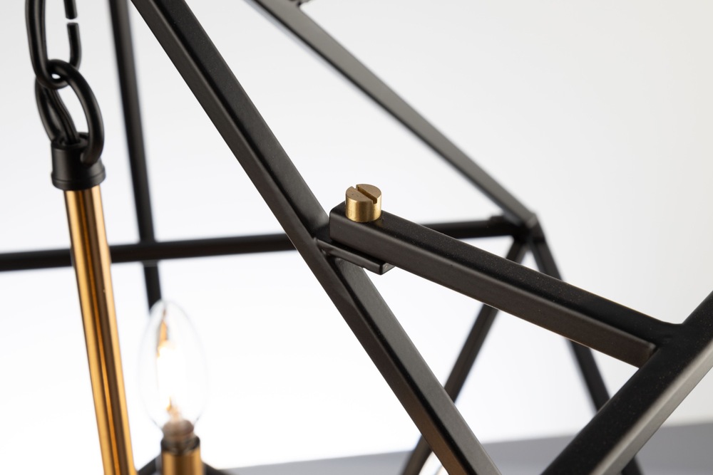 Linear in design, the Roxton collection is comprised of a matte black exterior cage which a diamond within a square that encases a harvest brass inner chandelier cluster. 4 light shown (larger versions available)