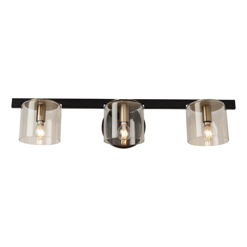 The Salinas Collection by designer Kevin Kraemer, has black frames complimented with brushed brass candles covered by clear cylinderical glassware. 3 light vanity model shown