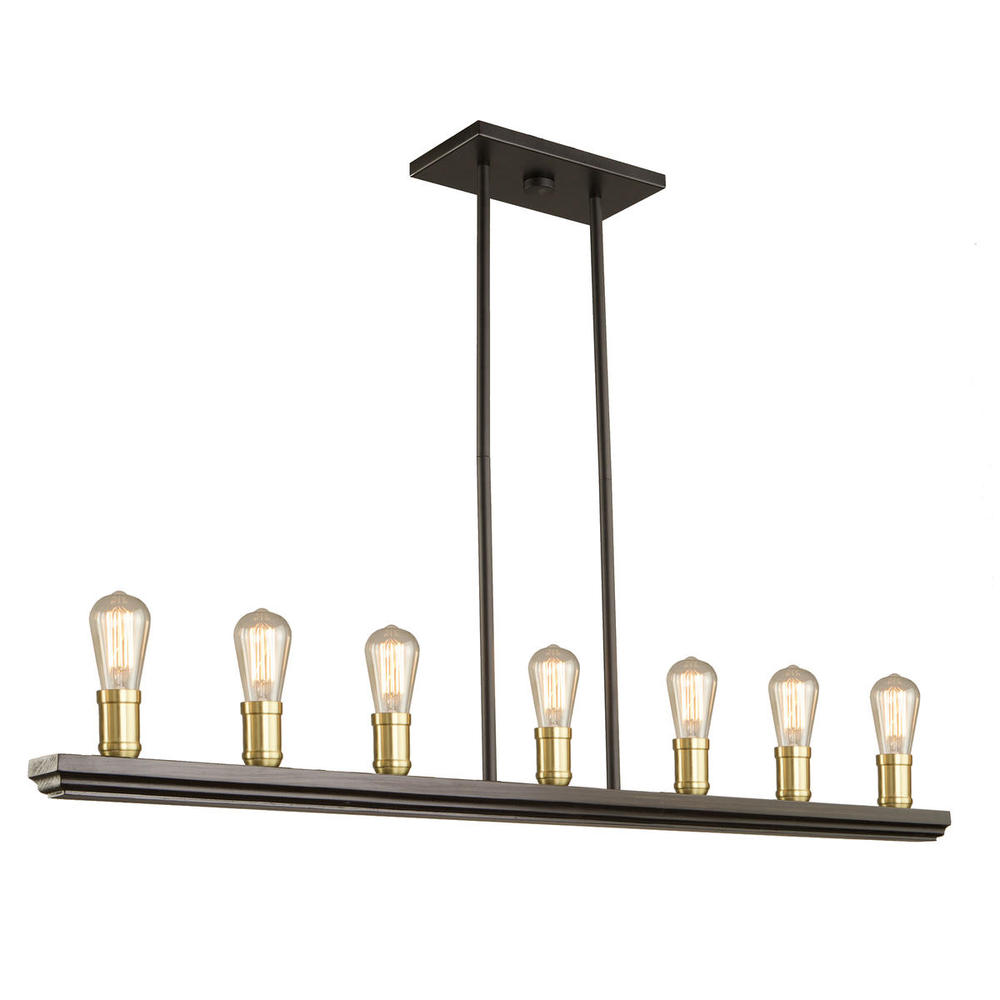 Clean lines with a multi tone design, the 7 lite linear chandelier from the "Sandalwood Collection" is elegant and precise. Satin Brass version (also available in Brushed Nickel). Hand made in North America with pride.