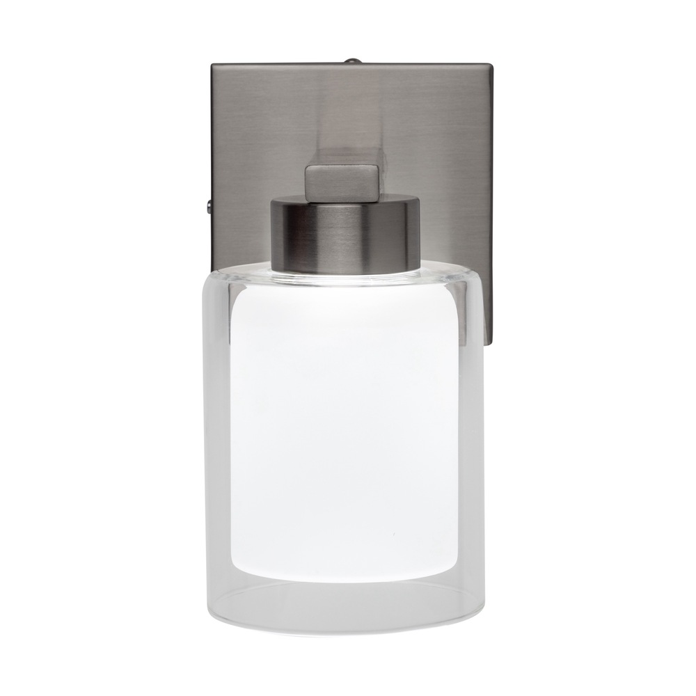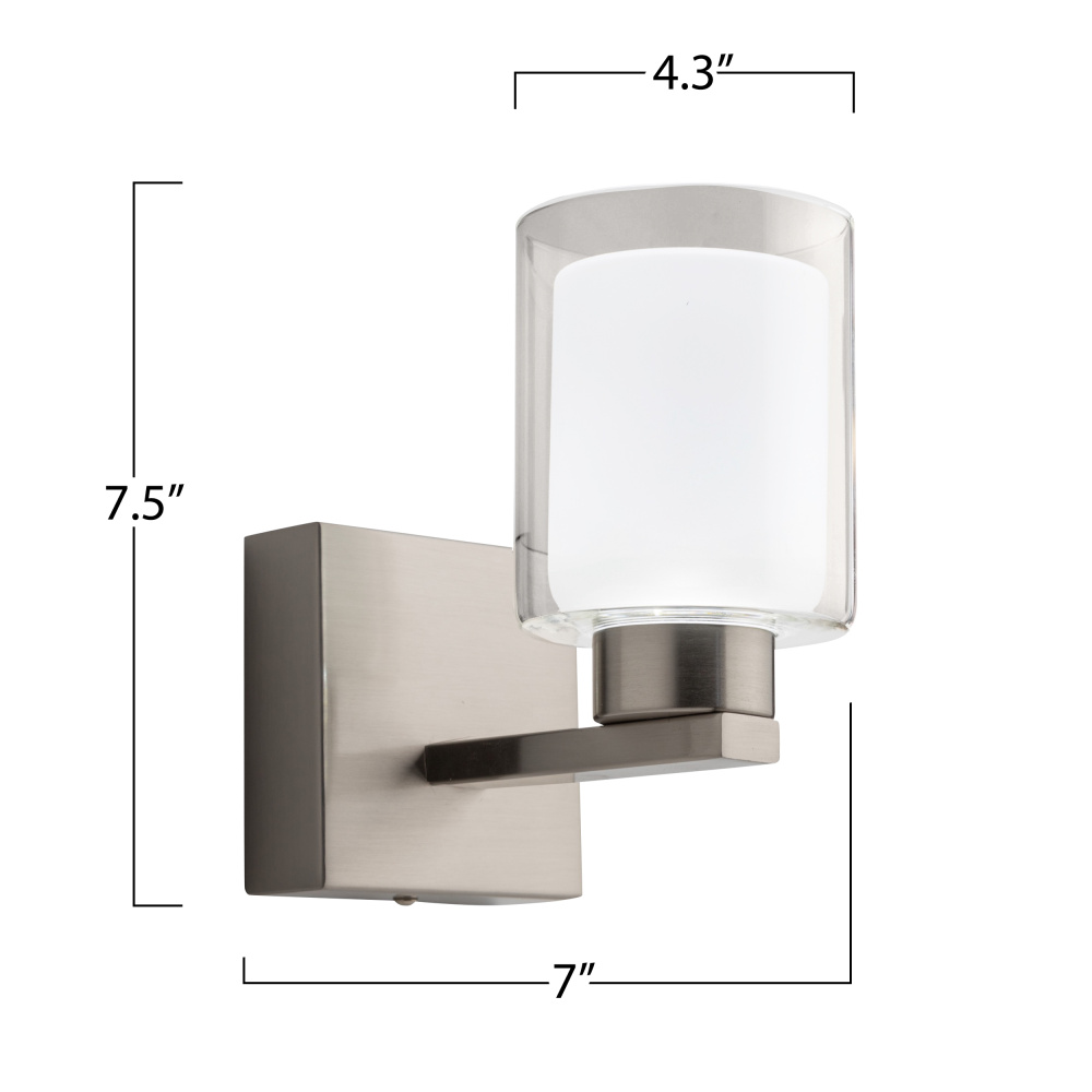 The Saville bathroom vanity collection boasts a distinctive double glass design, with a clear outer layer and a soft white inner layer that imparts a warm and inviting glow. To complement the elegant glasswork, the frame is adorned in a rich brushed nickel finish, adding a touch of sophistication to the overall design of this exquisite bathroom vanity collection. Additionally, the models in this collection come with a convenient LED switch, allowing users to effortlessly adjust the color temperature from 3000, 4000, and 5000 kelvin for a customizable and ambient lighting experience. Single wall sconce shown. (Also available in a 3 and 4 light versions.)