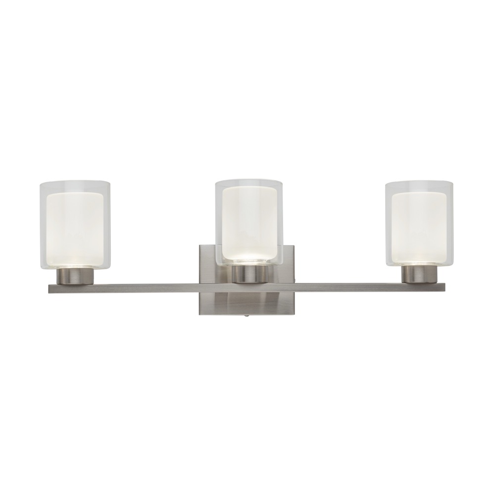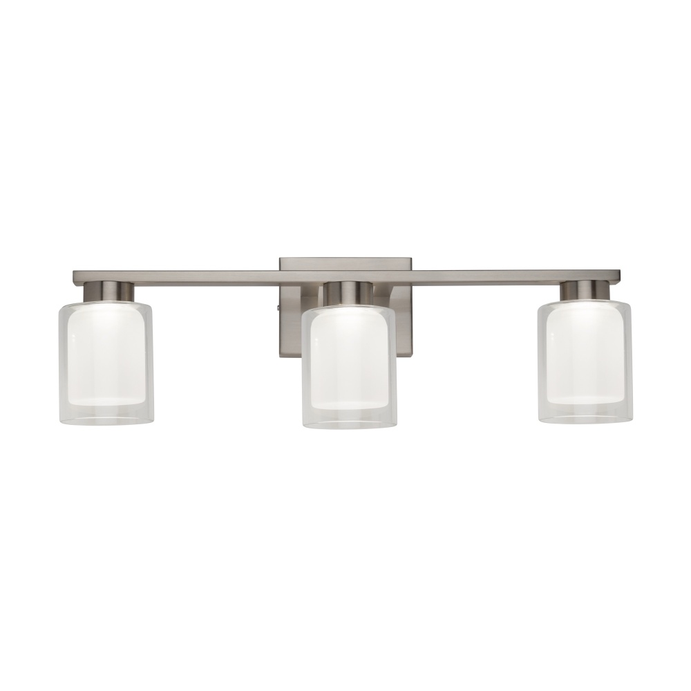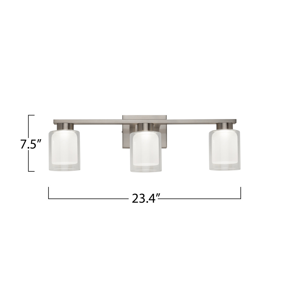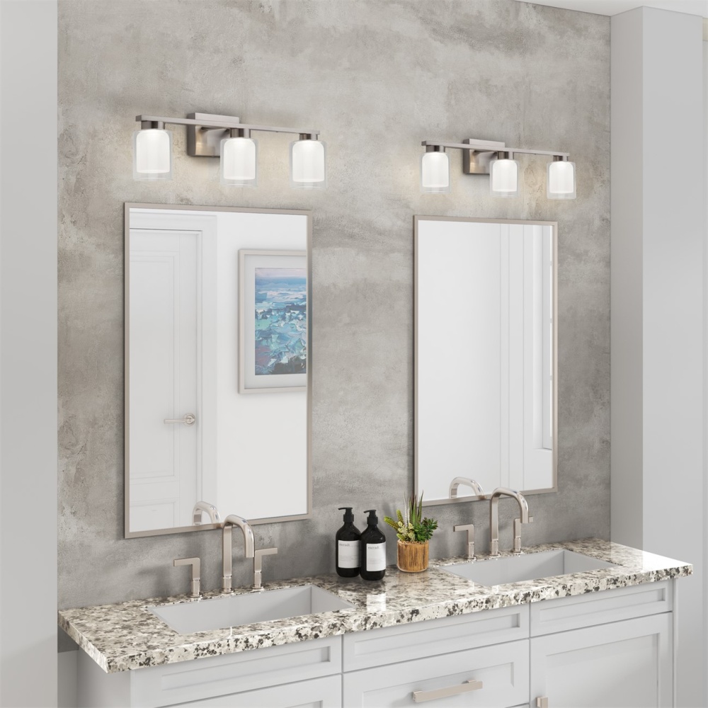 The Saville bathroom vanity collection boasts a distinctive double glass design, with a clear outer layer and a soft white inner layer that imparts a warm and inviting glow. To complement the elegant glasswork, the frame is adorned in a rich brushed nickel finish, adding a touch of sophistication to the overall design of this exquisite bathroom vanity collection. Additionally, the models in this collection come with a convenient LED switch, allowing users to effortlessly adjust the color temperature from 3000, 4000, and 5000 kelvin for a customizable and ambient lighting experience. 3 light wall sconce shown. (Also available in a single and 4 light versions.)
