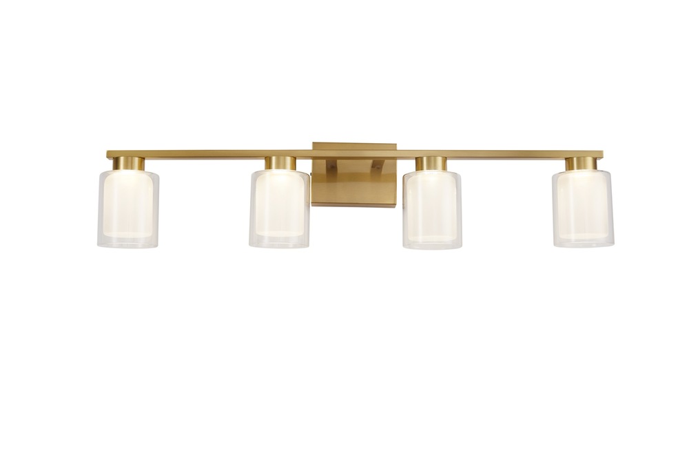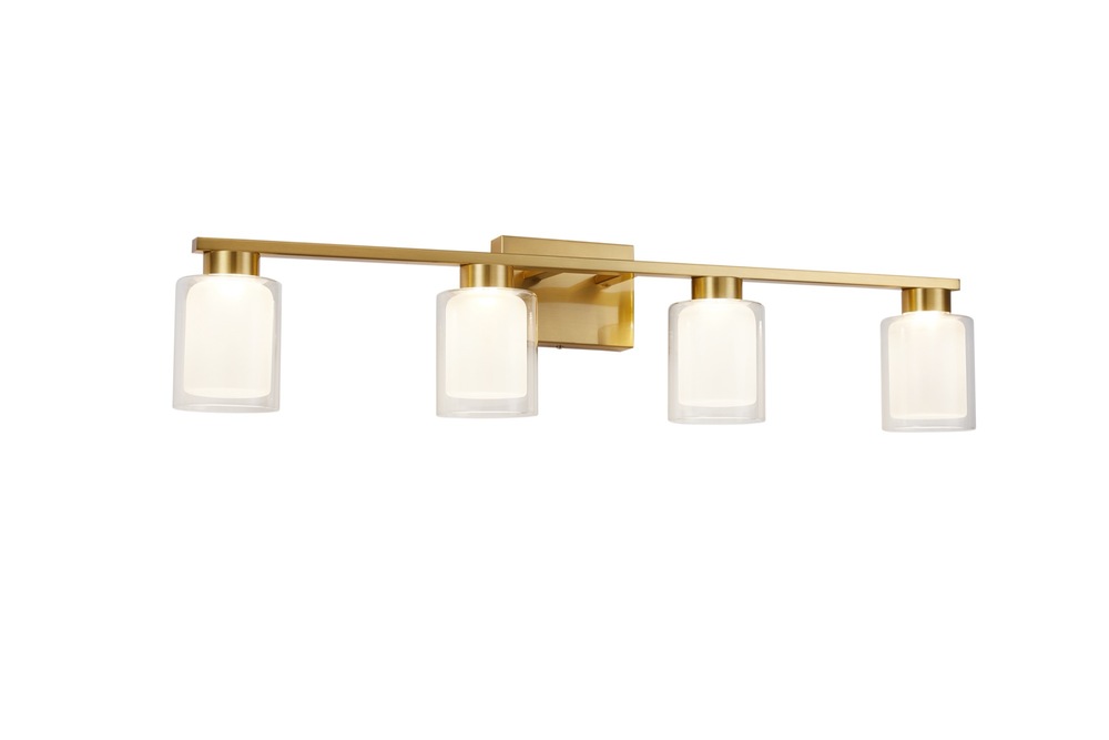 The Saville bathroom vanity collection boasts a distinctive double glass design, with a clear outer layer and a soft white inner layer that imparts a warm and inviting glow. To complement the elegant glasswork, the frame is adorned in a rich brushed brass finish, adding a touch of sophistication to the overall design of this exquisite bathroom vanity collection. Additionally, the models in this collection come with a convenient LED switch, allowing users to effortlessly adjust the color temperature from 3000, 4000, and 5000 kelvin for a customizable and ambient lighting experience. 4 light wall sconce shown. (Also available in a single and 3 light versions.)