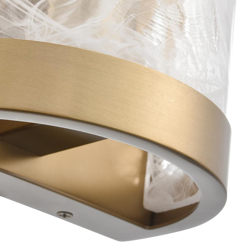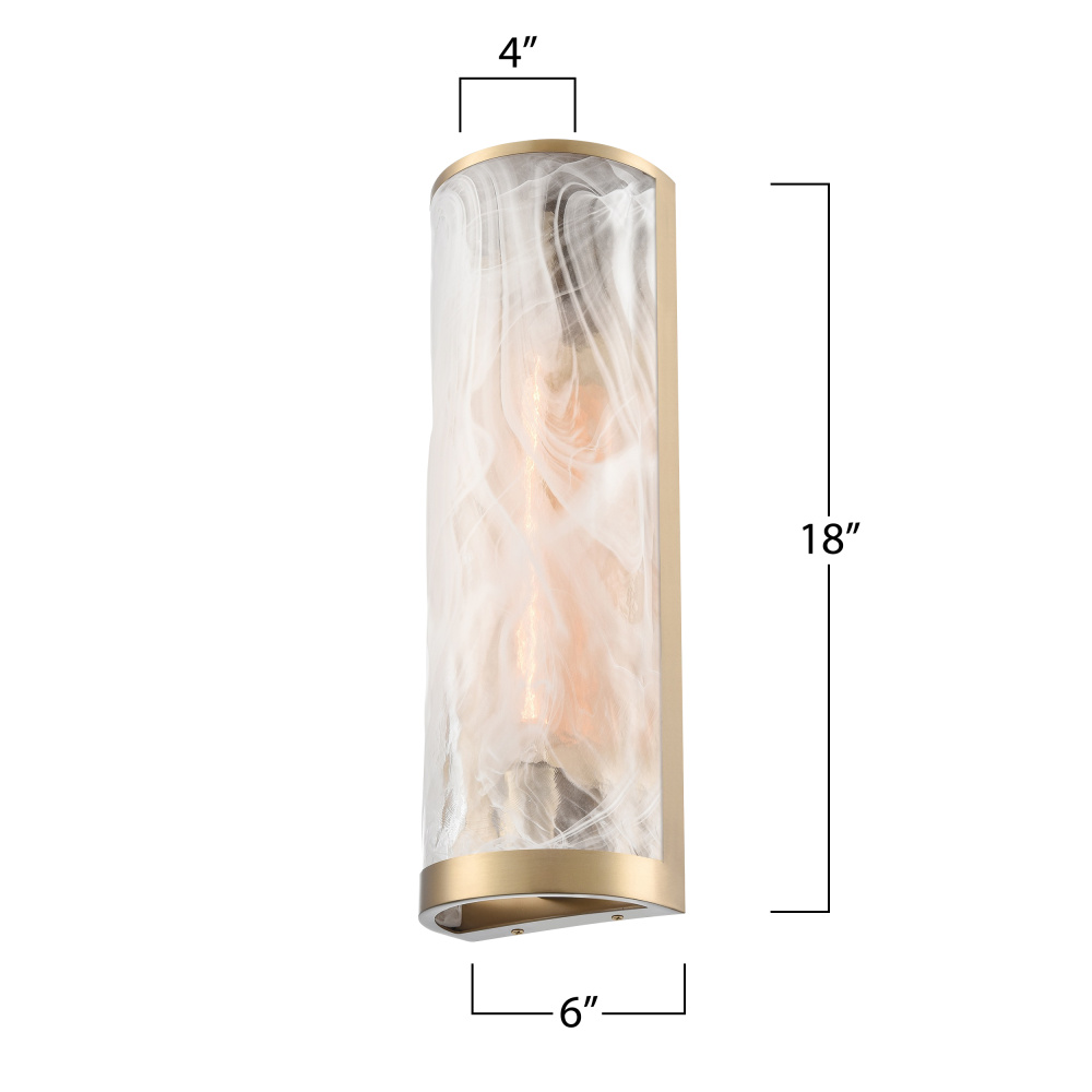 This stunning wall scone exudes timeless elegance, blending a brushed brass frame with the ethereal beauty of wispy white Murano-style glass panels. Its cylindrical silhouette radiates sophistication, creating a soft, ambient glow perfect for intimate spaces. The craftsmanship of the Skye collection by designer Kevin Kraemer is evident in the graceful harmony between its materials and design. This piece serves as both a functional light source and a work of art, elevating any room with its luxurious charm.