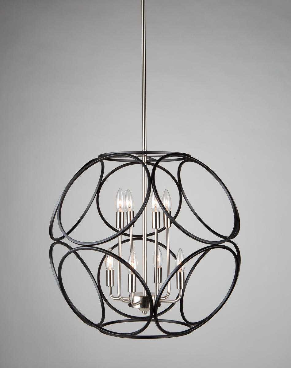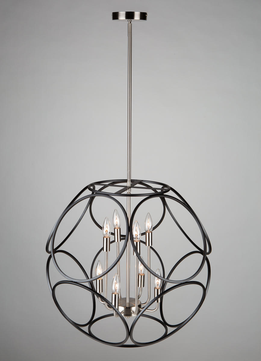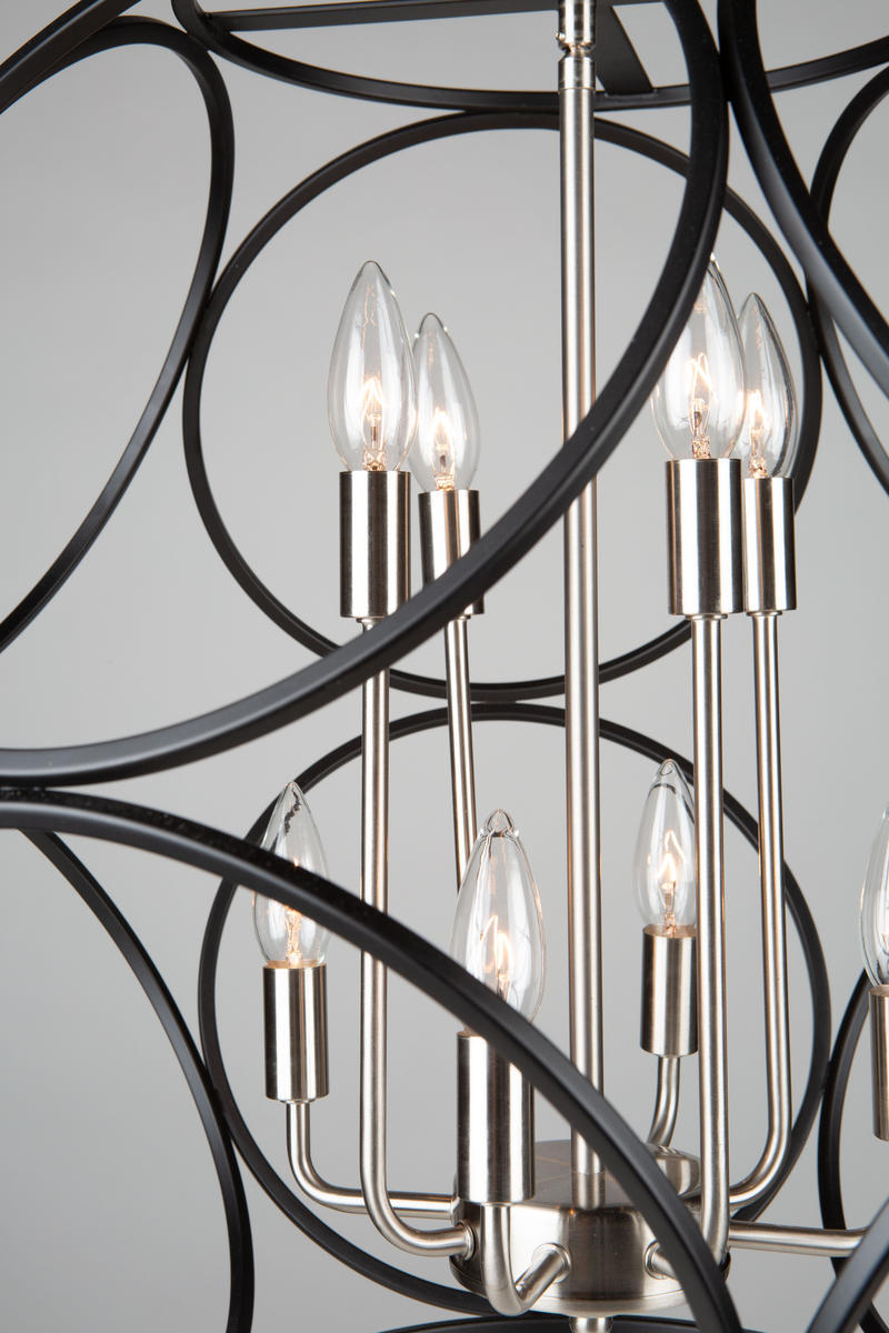 Beautifully styled, the "Sorrento" collection 8 light chandelier features a circular orb designs comprised of smaller circles. The exterior orb is finished is a luxurious matte black while the interior frame is plated in a satin nickel finish.