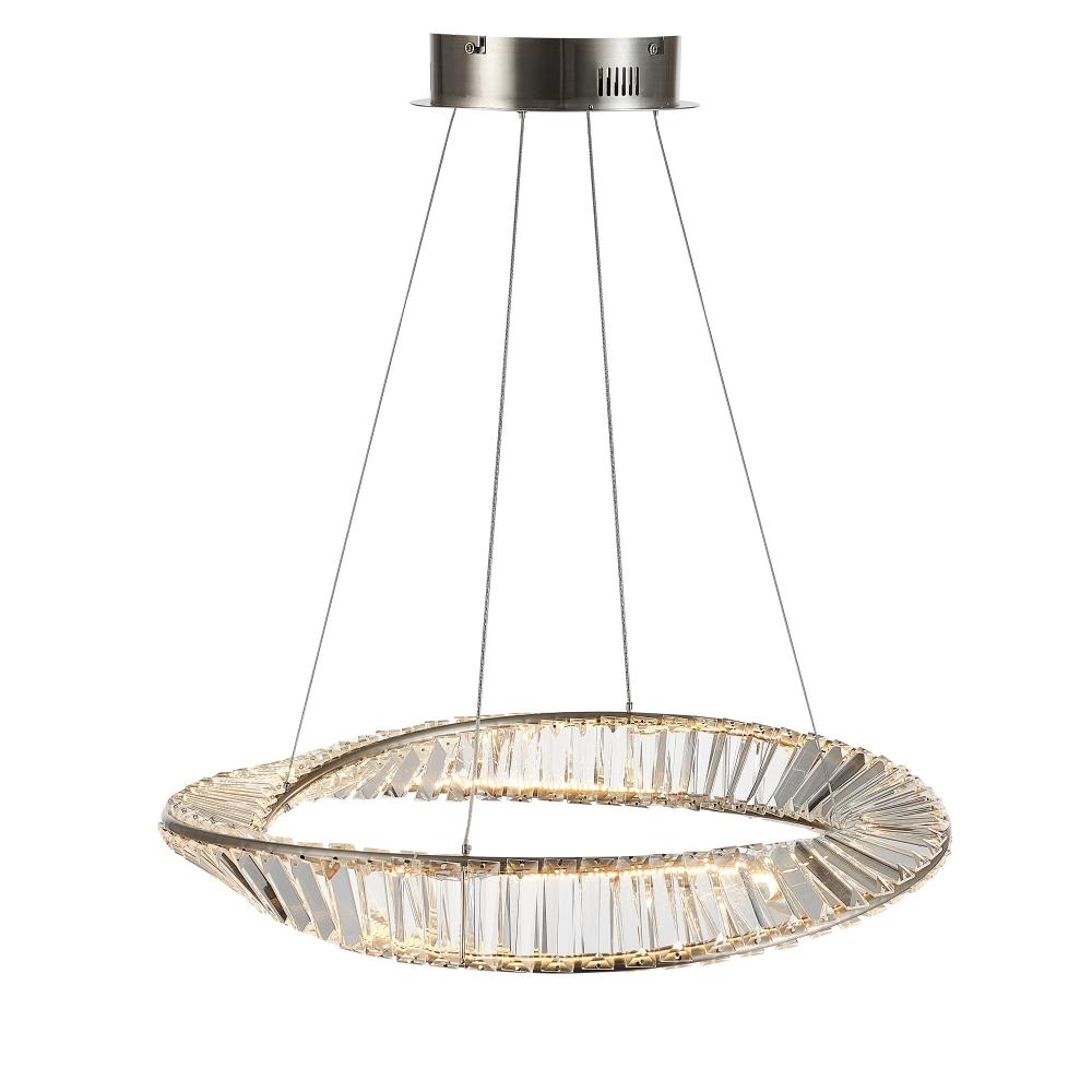 Sparkling from every angle, the Stella collection is simply timeless. The pendant is draped with authentic crystal and complimented with a Satin Nickel frame (also available in Brushed Brass). As your eye follows the frame it twists around the crystal in a unique fashion. This pendant is illuminated by bright and energy efficient LEDs (4 sizes available).