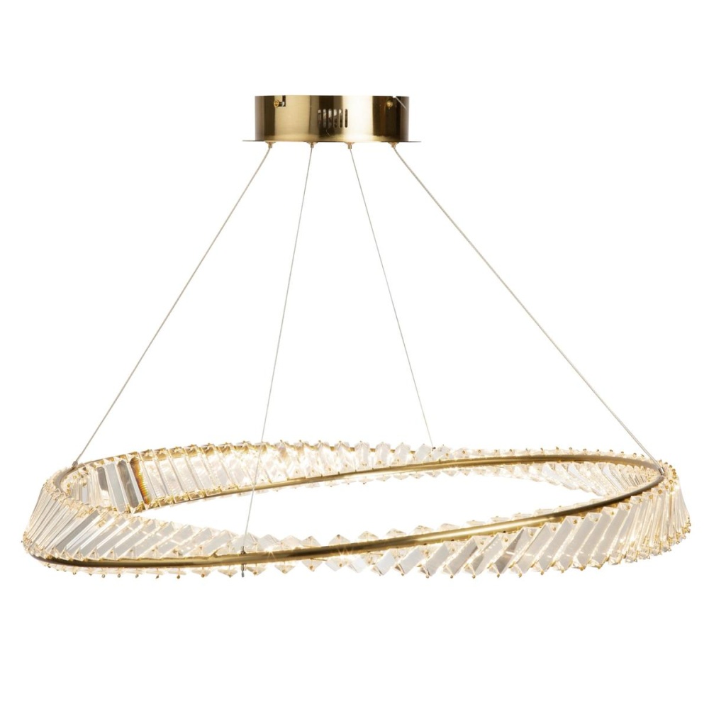 Sparkling from every angle, the Stella collection is simply timeless. The pendant is draped with authentic crystal and complimented with a brushed brass frame. As your eye follows the frame it twists around the crystal in a unique fashion. This pendant is illuminated by bright and energy efficient LEDs (3 sizes available).