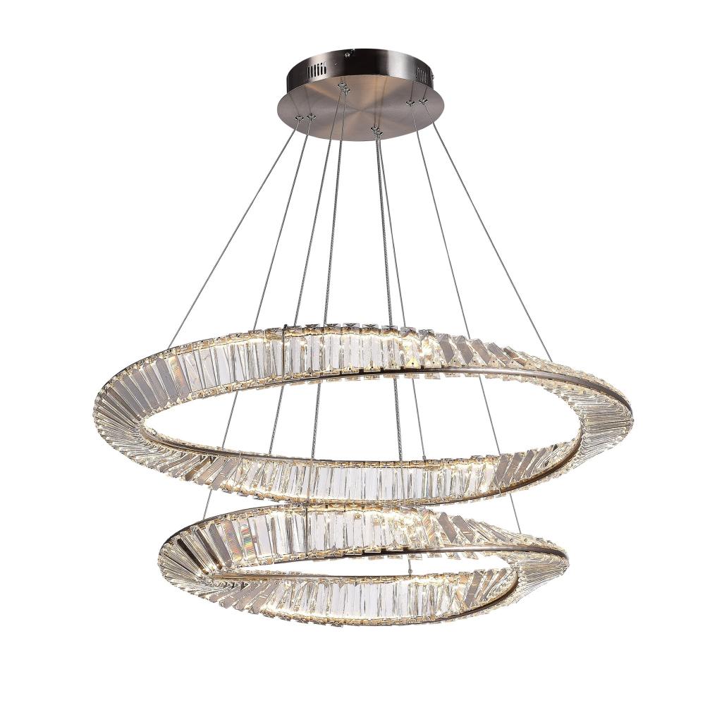 Sparkling from every angle, the Stella collection is simply timeless. The two tier chandelier is draped with authentic crystal and complimented with a Satin Nickel frame (also available in Brushed Brass). As your eye follows the frame it twists around the crystal in a unique fashion. This pendant is illuminated by bright and energy efficient LEDs (4 sizes available).