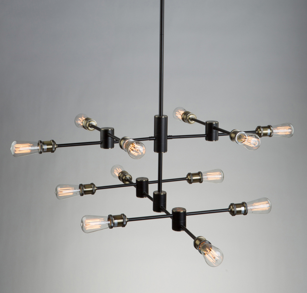 Modular in design, the "Tribeca" series elegantly adopts the beauty of retro Edison bulbs (not included). This version has a trendy two tone color factor. The frame is matte black while the socket cover, arm connectors and part of the canopy are in plated satin brass. An instant classic which brightens up any area. 12 light model shown - smaller sizes also available. Comes with hang straight for sloped ceilings and multiple rods for desired height.