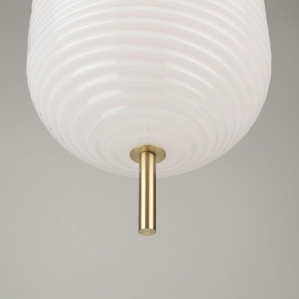 The Vita single pendant collection features a distinctive oversized glass design, adding a unique and eye-catching element to its contemporary lighting aesthetic. This model is shown with a ribbed white glass on a brushed brass frame. This model is easily height adjustable.