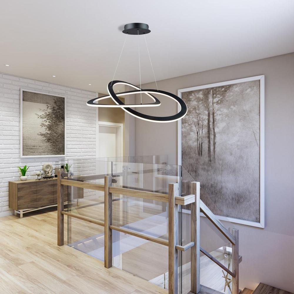 The "Wave Collection" is named after its curvy organic design. A perfect addition to any modern to transitional setting. The chandelier is finished in a semi gloss black and is suspended by aircraft type cables. It is illuminated by bright energy saving LED technology. This large chandelier is available in a smaller version with a semi flush to match.