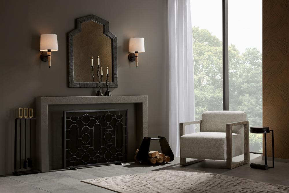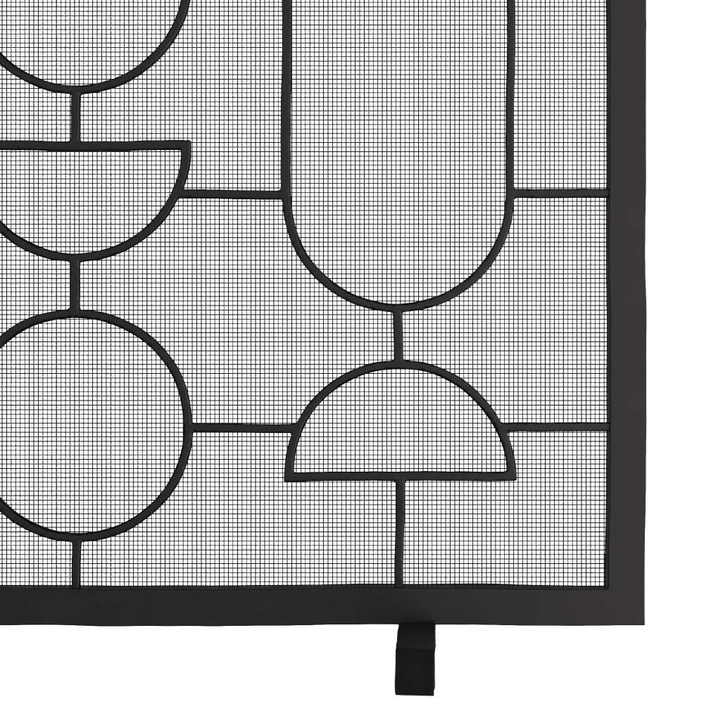 A sophisticated way to block stray embers, Adamo was forged of natural iron with an inset screen of woven mesh. Fine geometric linework accents its structure, encompassing pleasing ovals, circles, and oblong shapes.
