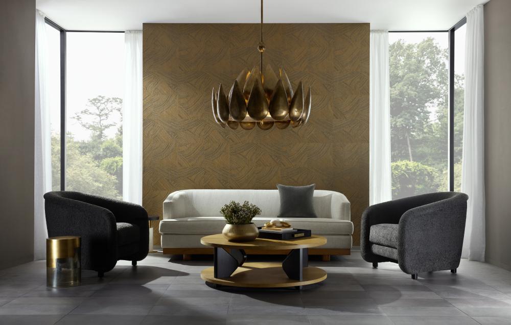 This hammered chandelier of vintage brass is both bold and Brutalist in form. Two layers of Lotus petals suspended from a sturdy support encircle a frosted acrylic diffuser, allowing just the right amount of light to peek through for illumination. A vintage brass floral finial provides an extra detail on the centered pipe. Damp-rated, although limited covered outdoor conditions may affect finish. Finish will vary.