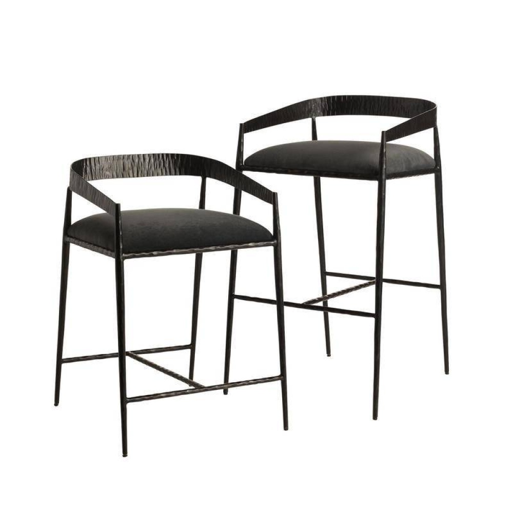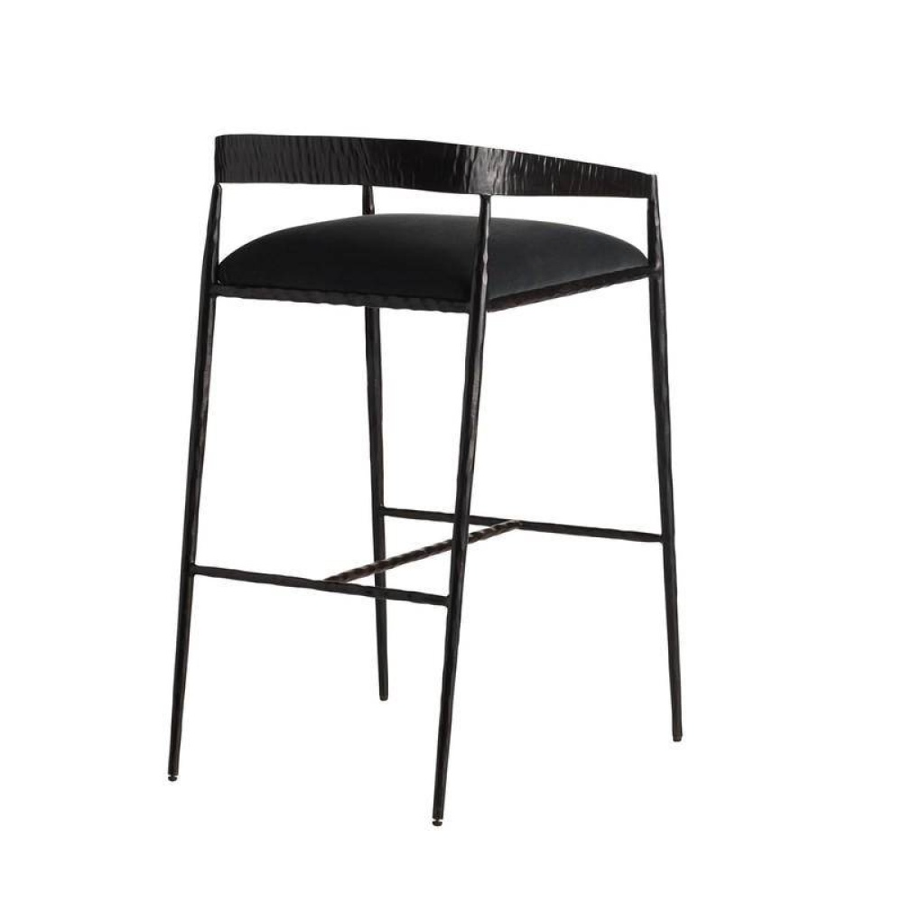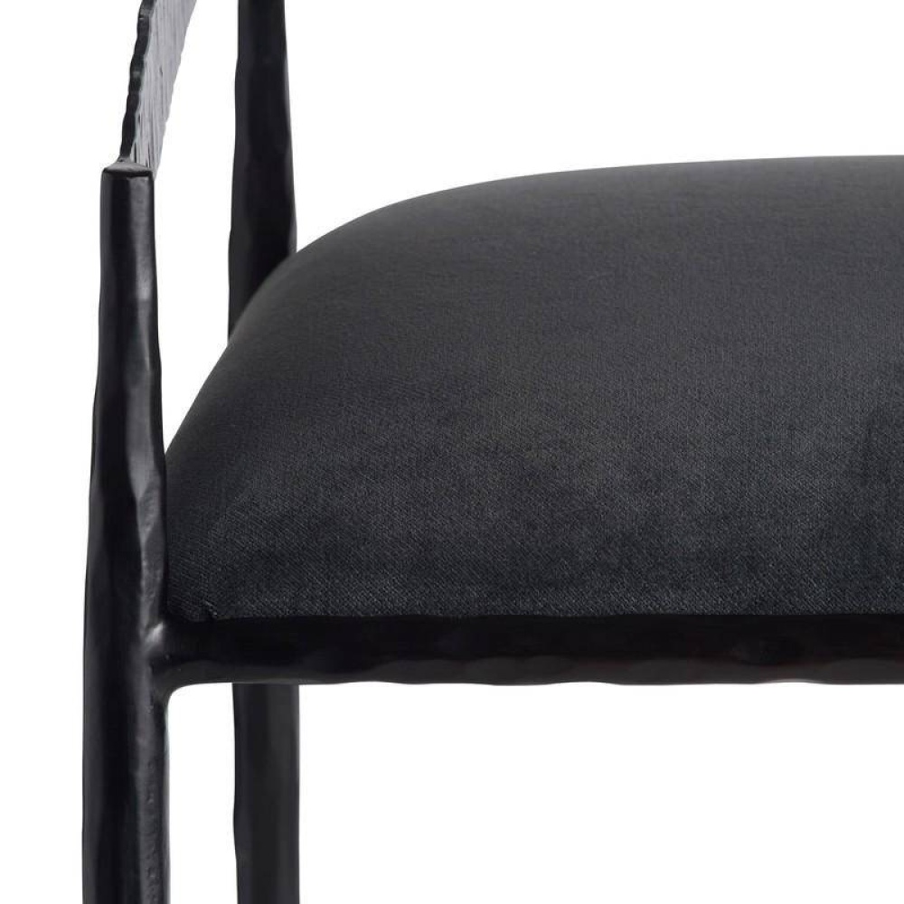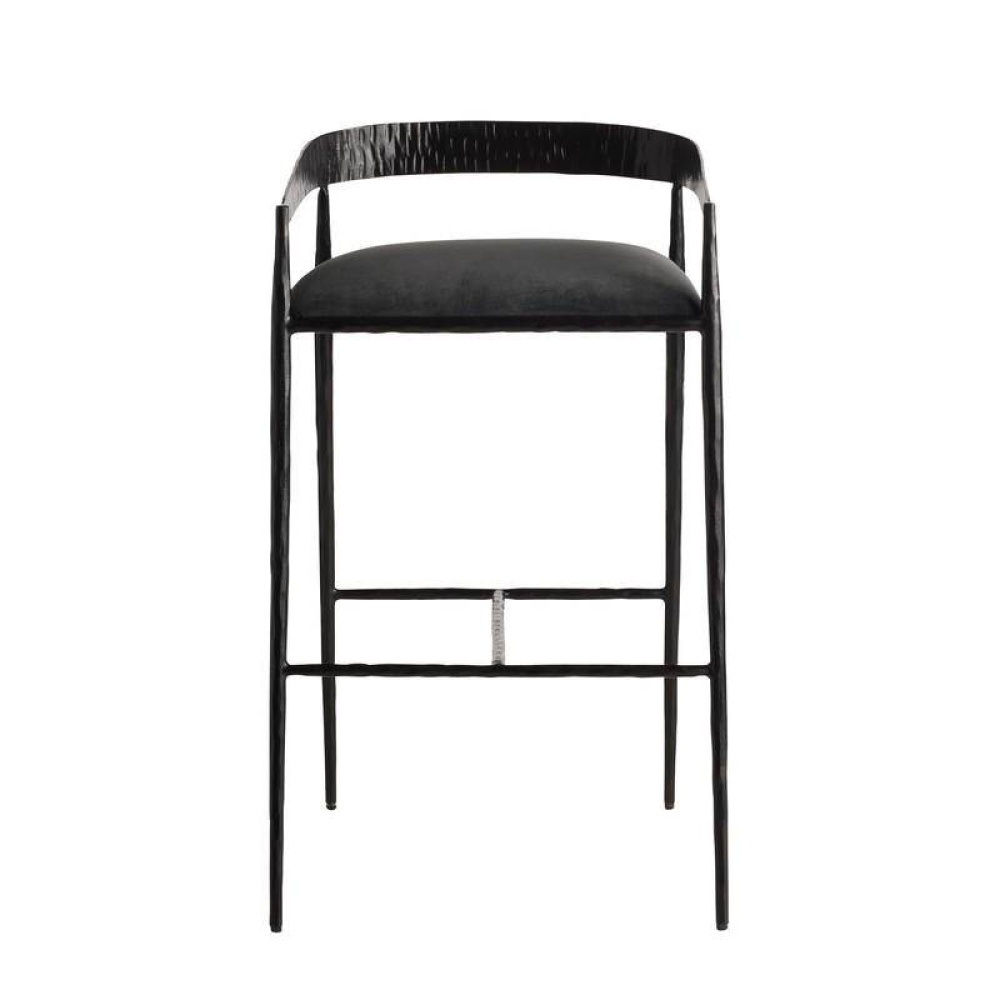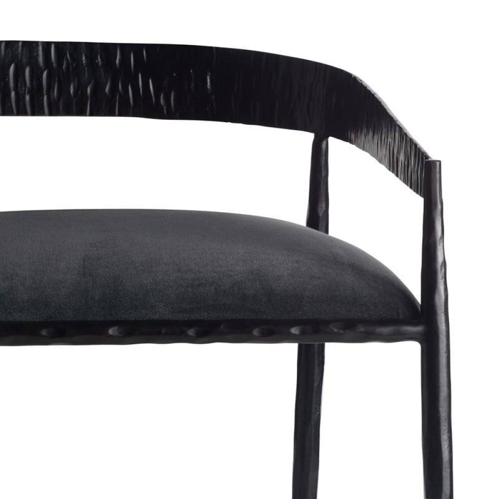Sharp angles and a raw curvature define this stool’s bold aesthetic. Natural iron is hammered by hand to create rich impressions along the shallow back, while the hand-forged legs yield more delicate details. The tight seat is covered in our performance velvet in midnight grey, elevating the façade while assuring it is as durable as it is stylish. Finish will vary.