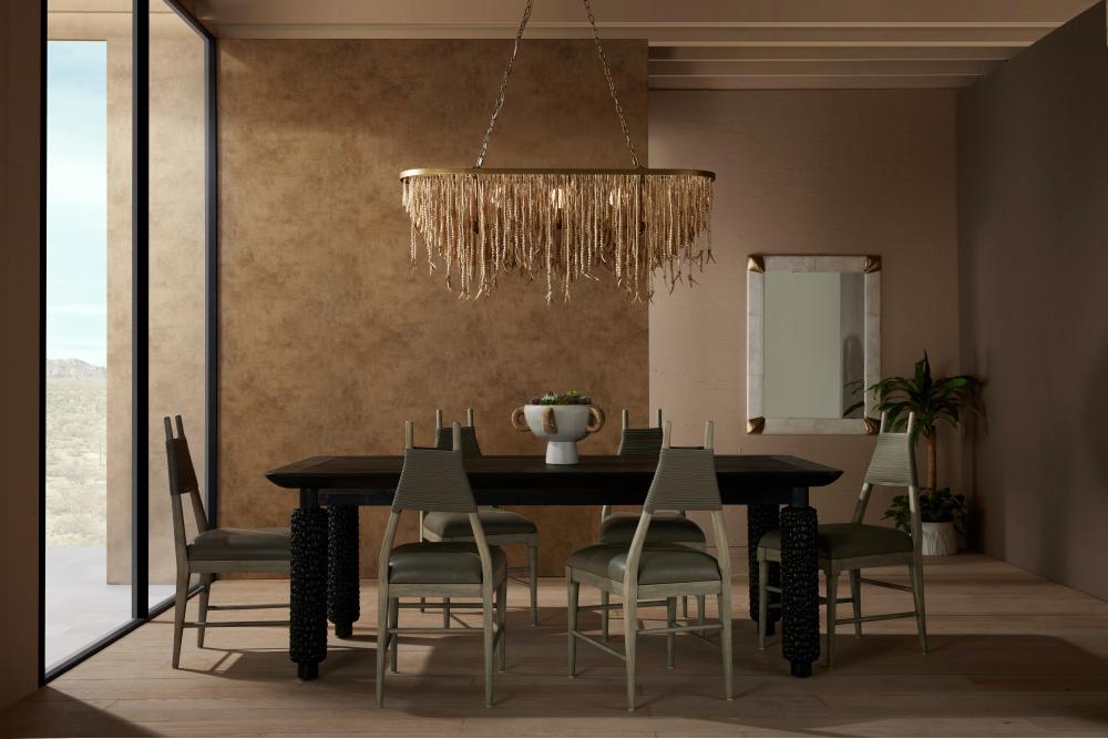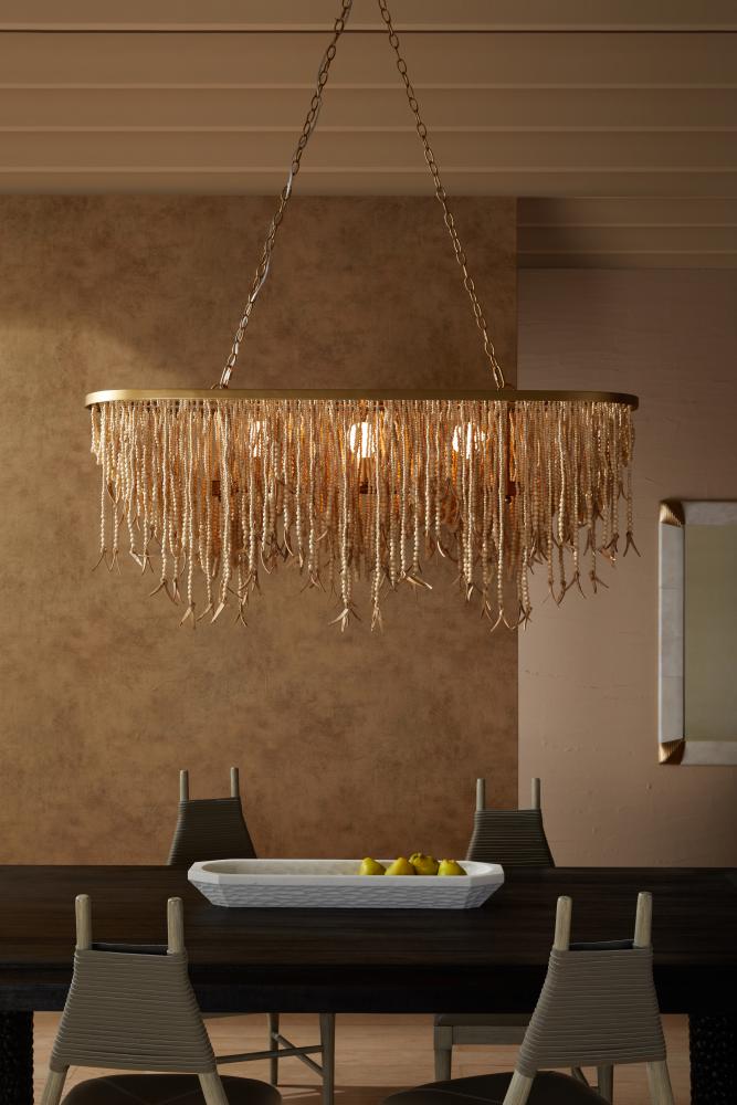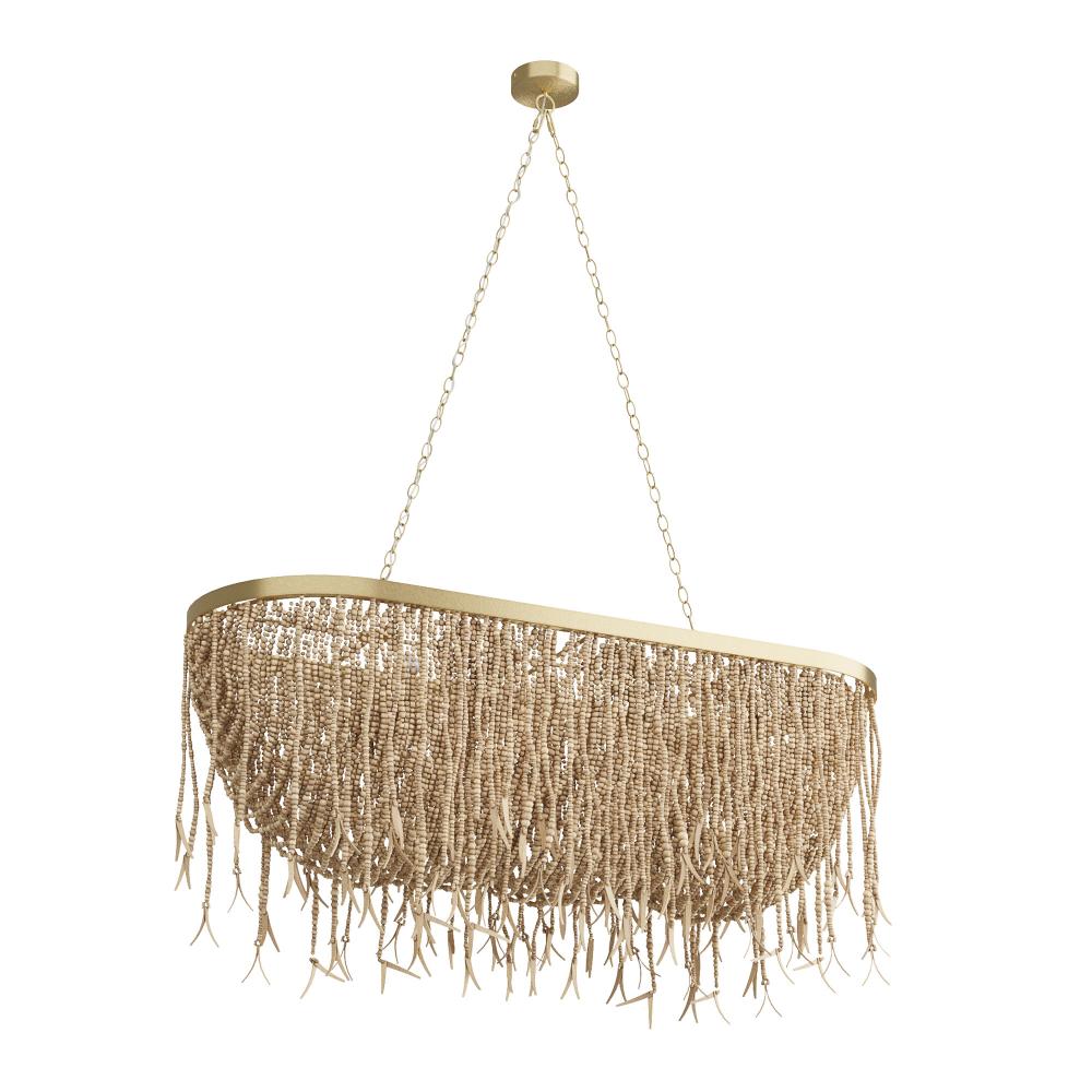 A natural take on a classic design, the Baja defines beauty and balance in organic materials. The layered, three-point construction is crafted from wood and coconut beads—both in a natural wood finish–that are strung along an antique brass steel frame, showcasing a mélange of moody hues. Coconut shell talons finished in a matching natural wash hang from the wooden bead strands and offer extra opacity to its airy aesthetic. Size scaled for illuminating a long dining table. Finish will vary.