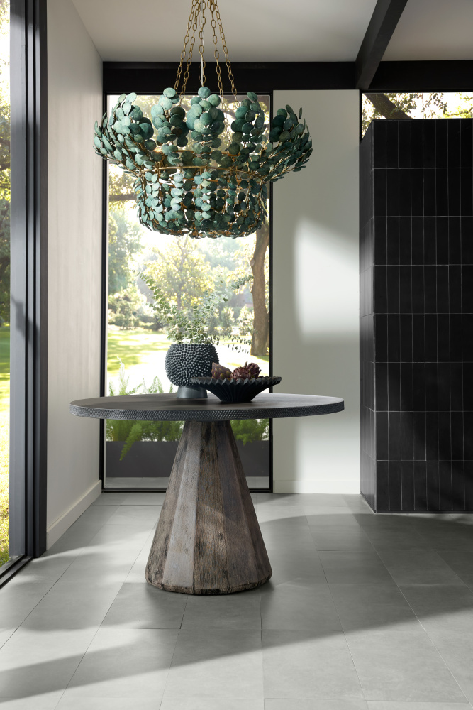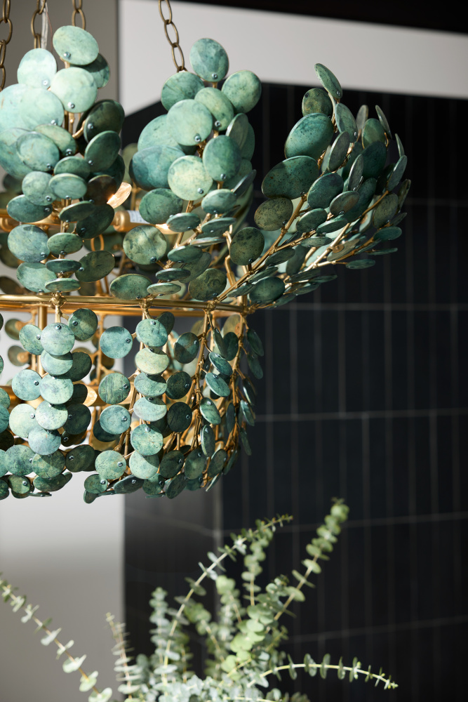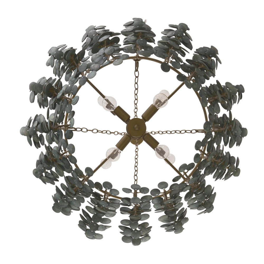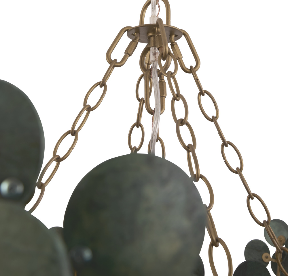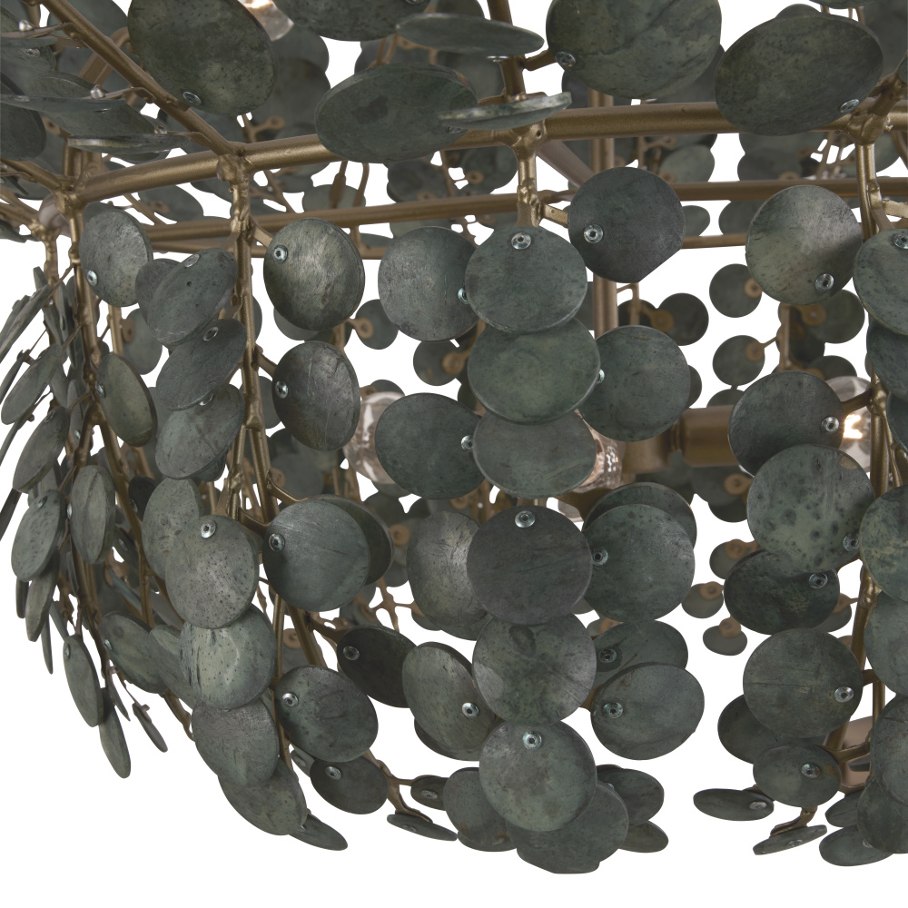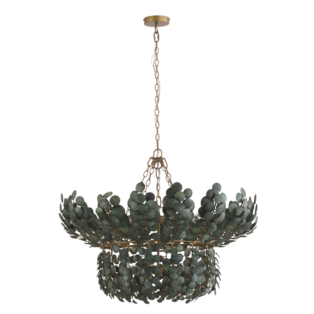 The lush allure of tropical foliage informs the two-tiered Bilal. Suspended from antique brass iron finished chain, discs of sustainable coconut shells are strung together to reveal a vision of illumination. Finished in a rich eucalyptus hue inspired by succulent plants. Finish will vary.