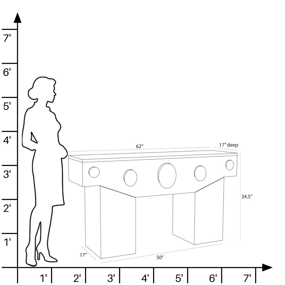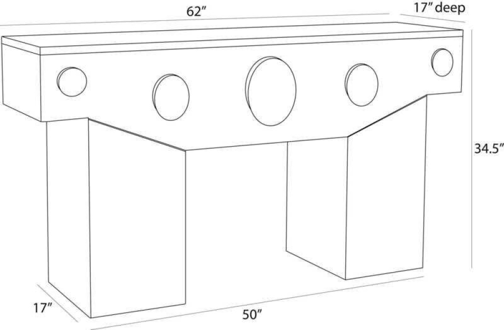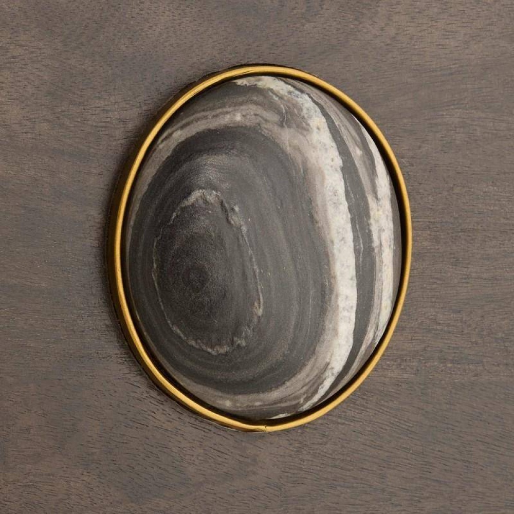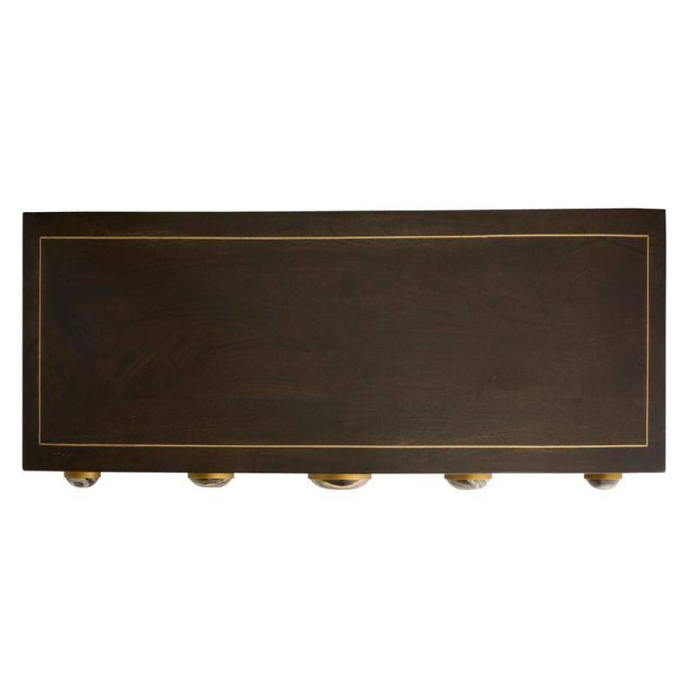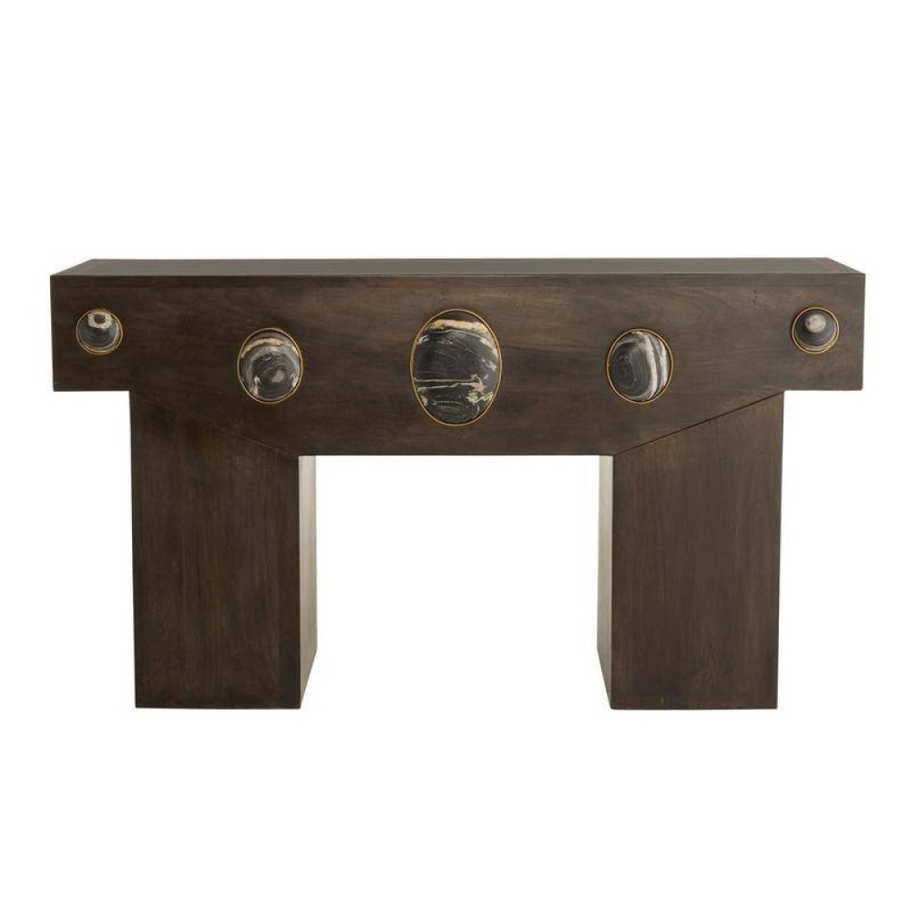 Our substantial wood console of umber mango wood is full of artisan details that showcase the designer's craft and consideration. Inlaid antique brass fittings and linework enhance the clean lines, while inset cabochons of bengal marble recall handmade jewelry. Finish will vary.