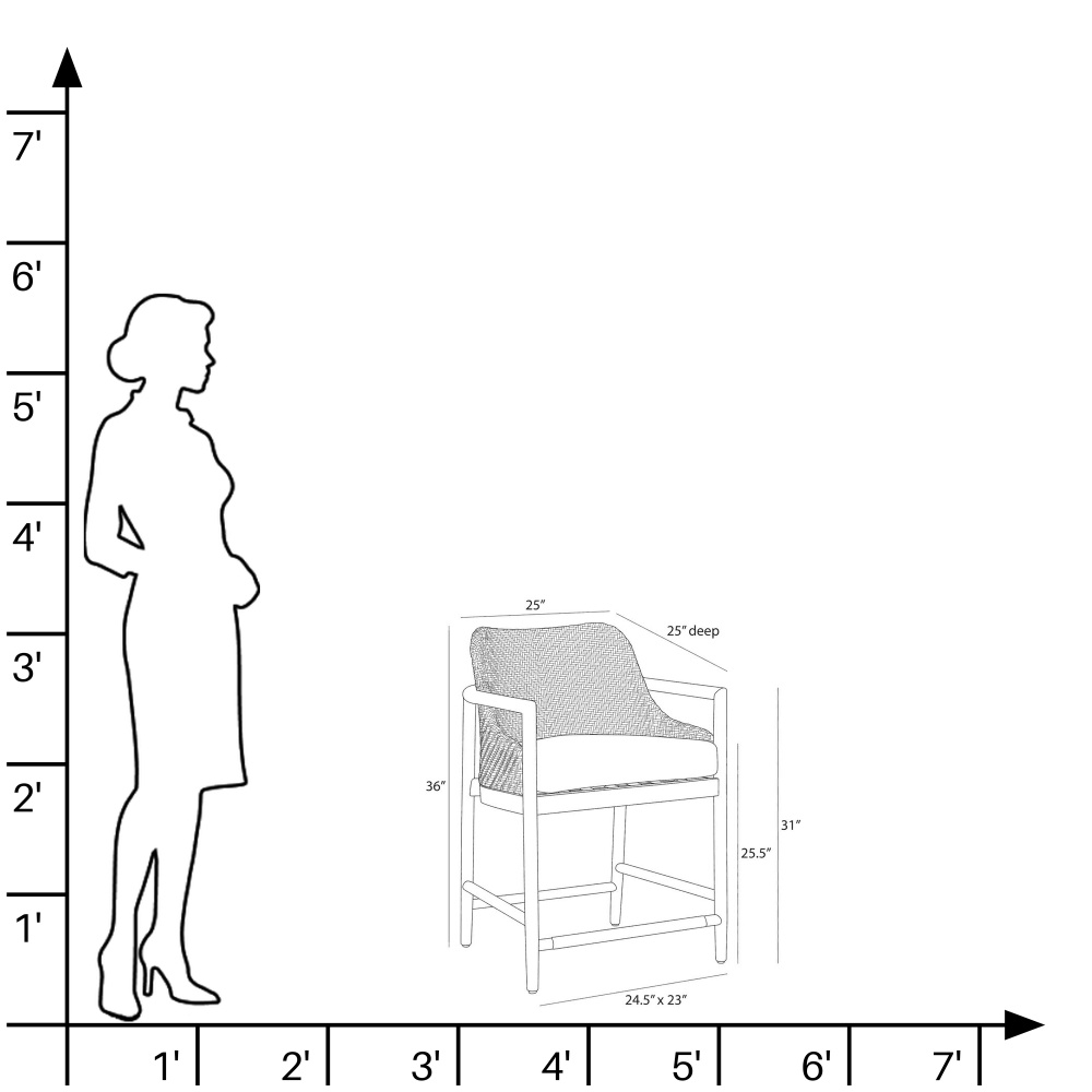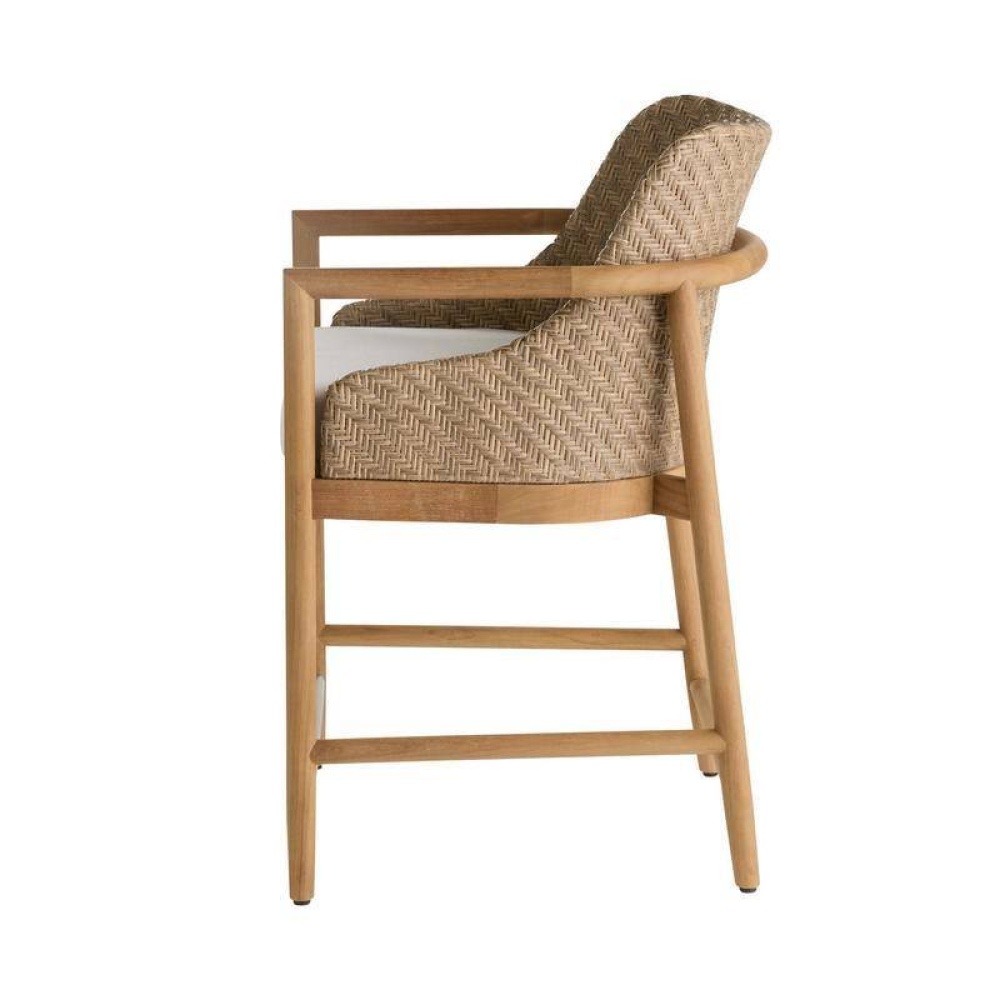 A taller adaptation of our popular chair, the Chilton updates the sleek lines and open arms of a mid-century icon. An organic spin on the era’s design, the sculptural back of dark blonde synthetic rattan is cradled by a solid natural teak wood frame. A supportive cushion of our pearl outdoor performance bouclé was designed to withstand the elements. Finished with stainless steel footrest caps. Finish will vary.