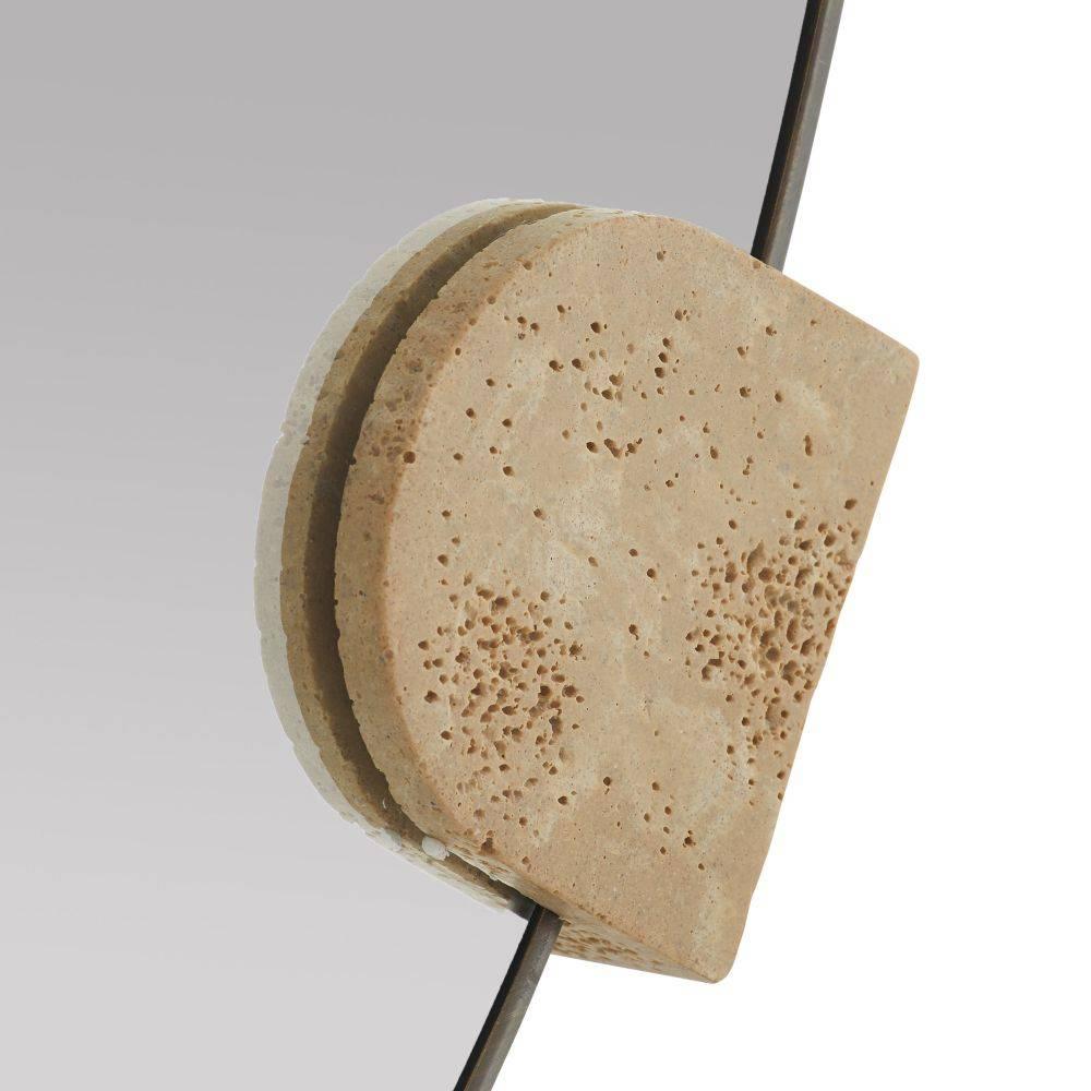Unexpected materials transform and elevate a classic shape, making the Clasp Wall Mirror a subtly stylish addition to any room. A trio of faux travertine resin suspend the mirror, framed in bronze-plated steel, adding the contrast of a warm, deeply textured material to its smooth mirrored surface. Hung vertically with cleat in the back for security. Finish will vary.