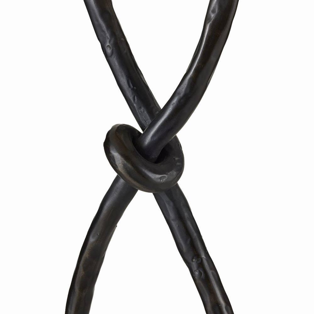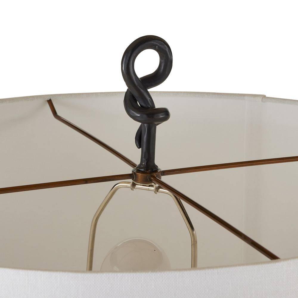 Dual rods of hammered, blackened iron twist, turn, and knot to form the base of this linework-inspired lighting. Secured on a substantial white marble base, the Dutton is finished with a white linen Empire shade topped with a clever knotted finial. Clear silver cord.
