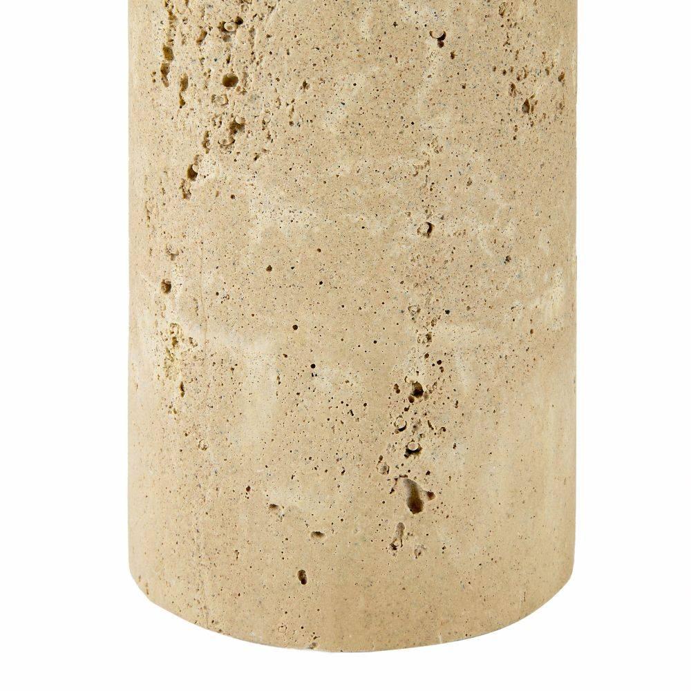 The luminous shimmer of antique brass creates a halo effect behind a rounded base of sand faux travertine. Its rounded intersection is soothing yet captivating, while the natural voids, veining, and color variants in the stone make this lamp a statement piece. Finish will vary.