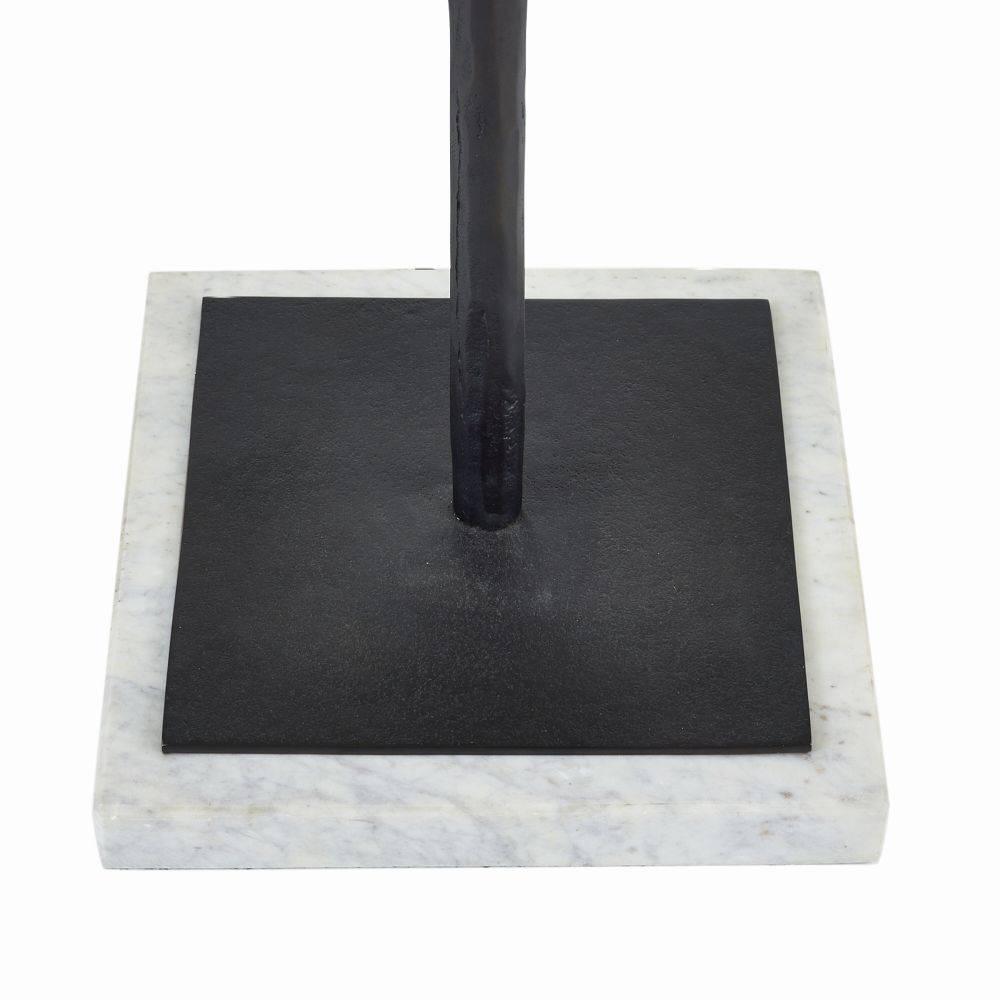 Intersecting spears of hammered blackened iron suspend an off-white linen drum shade with aplomb. Mounted on an elegant square base of white marble, this low-task lamp is ideal for illuminating a lounge area or dim corner with style. Clear silver cord.