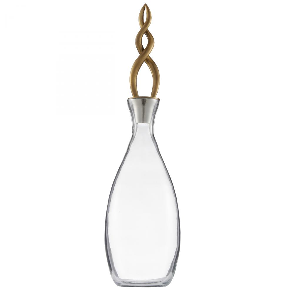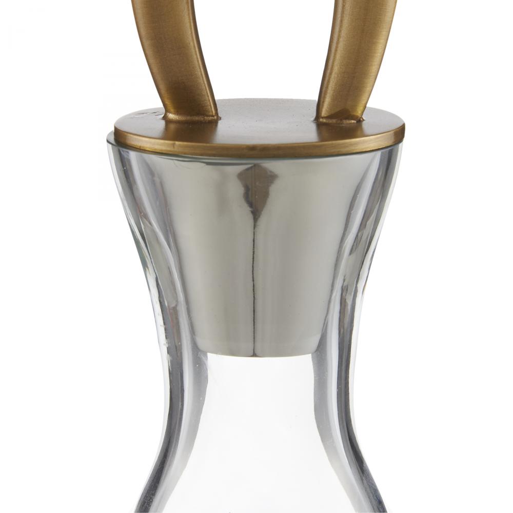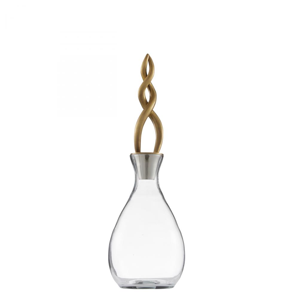 A pair of smoke-luster glass decanters is a dynamic addition to any tabletop tableau. Jewelry-inspired vintage brass stoppers twist and spiral upwards, mimicking a calming plume of smoke from burning incense.
