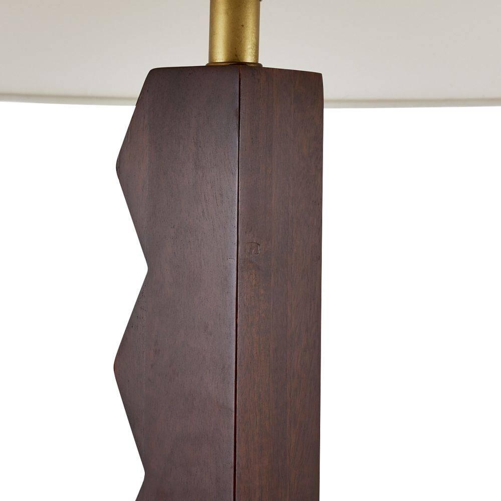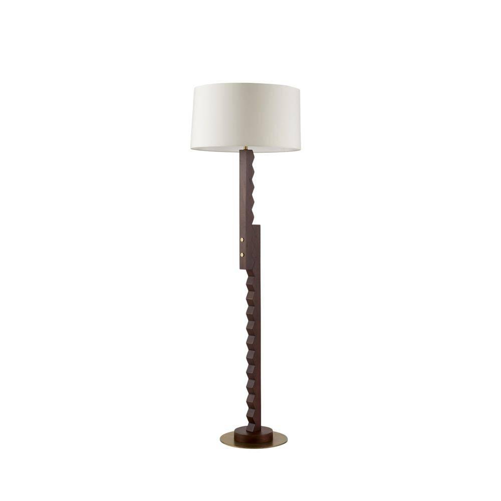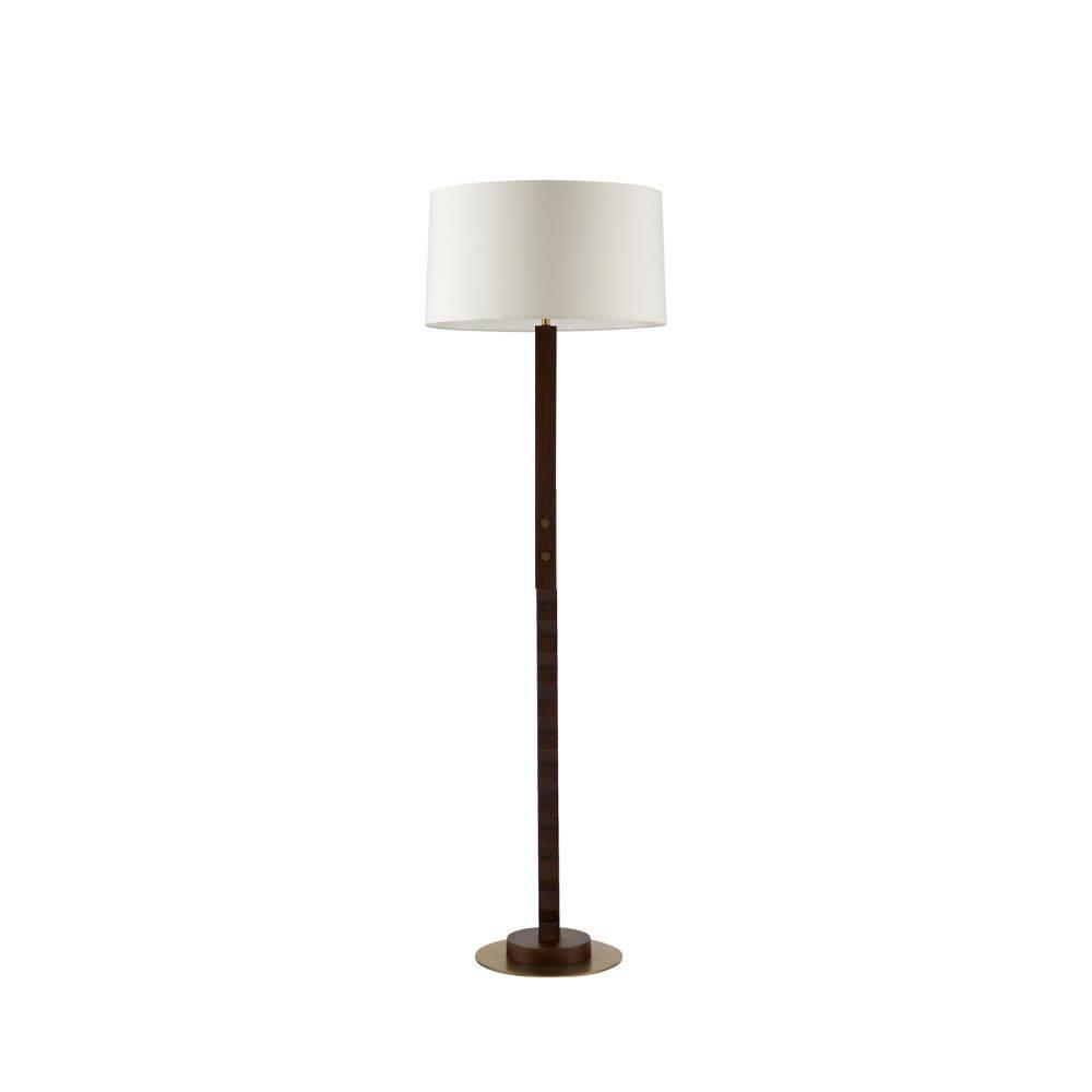 A dual base of saw-toothed dark walnut mango wood lends the Elvis an industrial edge. Handcrafted with antique brass rivets that match its circular base, this gear-like style recalls the machine age. Topped with a white microfiber drum shade and matching finial. Clear silver cord.