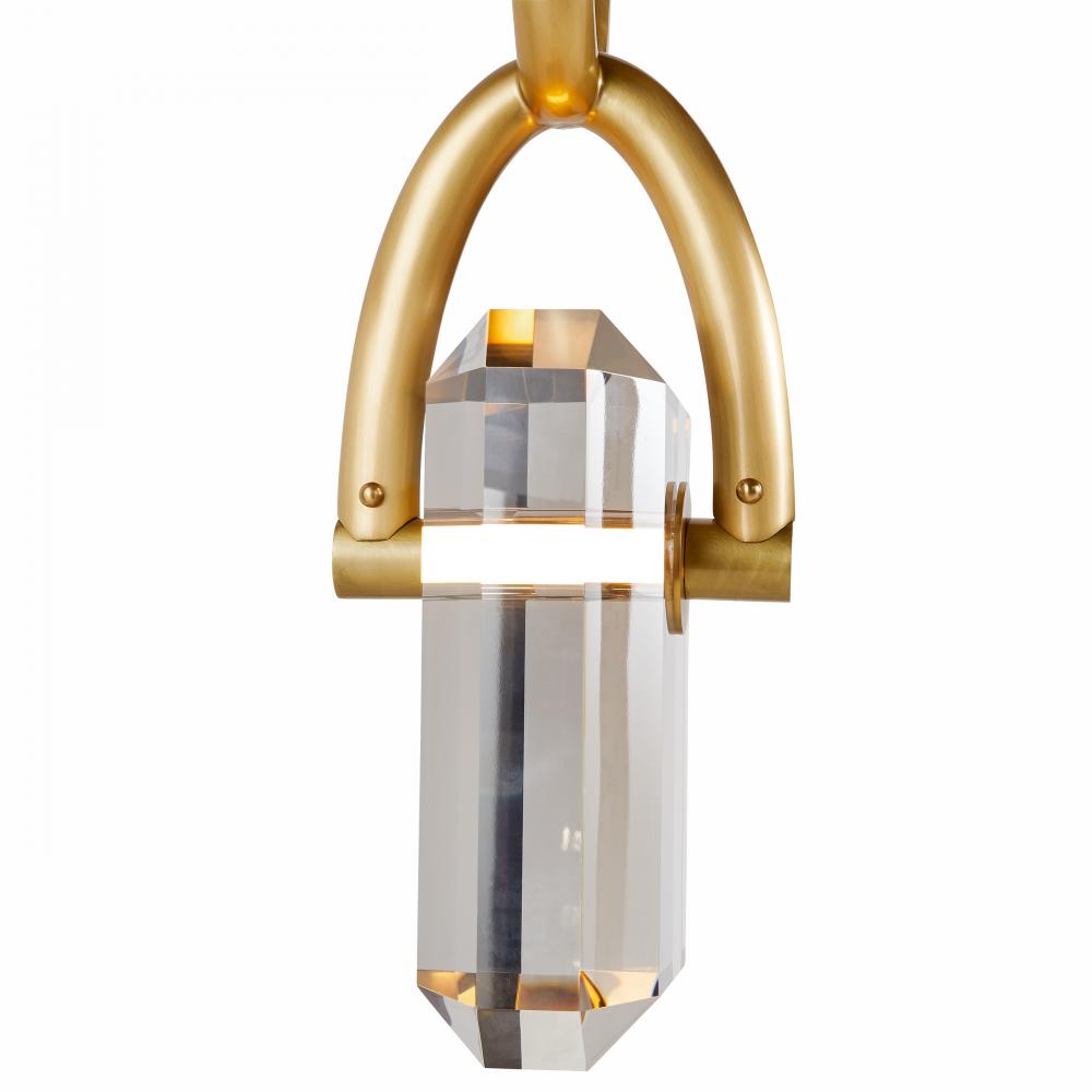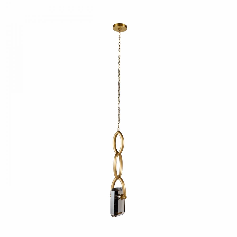 A thick chain of antique brass steel links together to form a stylish setting for our Estate pendant. Designed to hold a faceted LED-lit “gem” of smoke crystal, this impactful fixture is jewelry for the home.