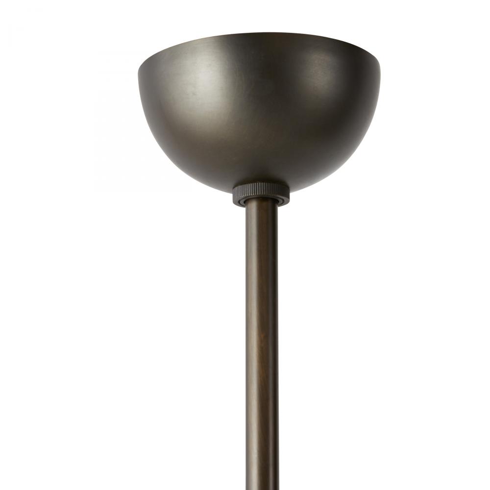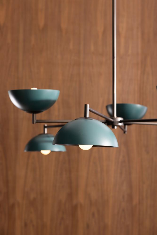 Powder coated in a deep Aegean hue, a modernist style of steel adds a pop of subtle color to your space. Suspended from a slim English bronze-plated steel canopy and pipe, the colorful plates angle both upwards and downwards to create a warm, even glow.