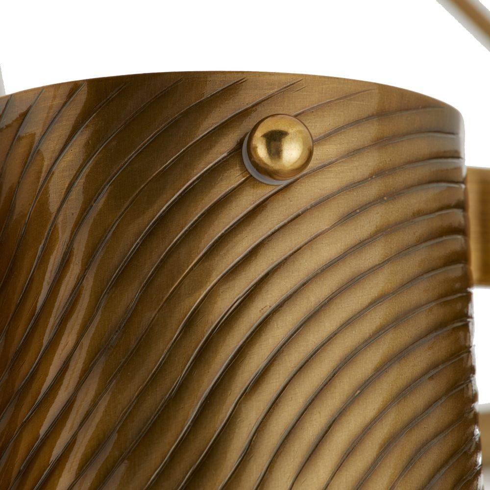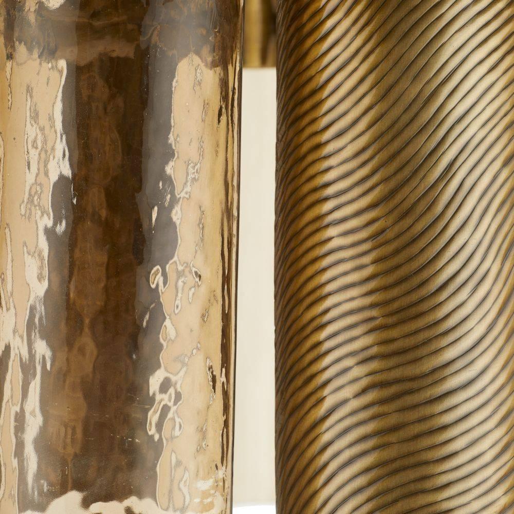 Scaled for high ceilings, this impactful fixture adds a reflective glamour wherever it is placed. The Empire silhouette alternates faux bois-etched leaves of vintage brass-plated iron with smoke slump hammered glass for a striped effect. The two-tiered form is suspended from a brass-plated pipe and canopy. Damp-rated, although limited covered outdoor areas may affect finish. Finish will vary.
