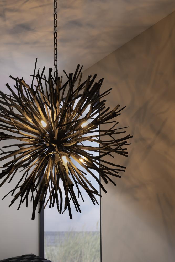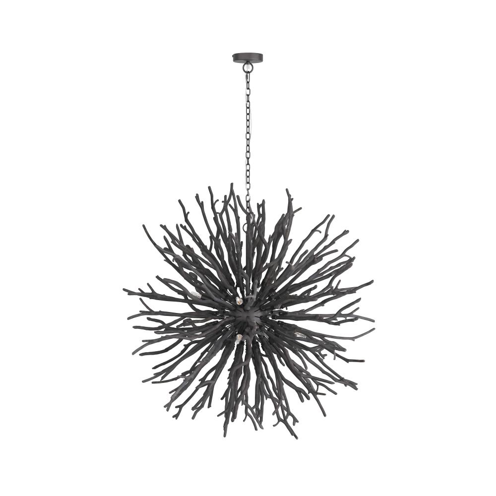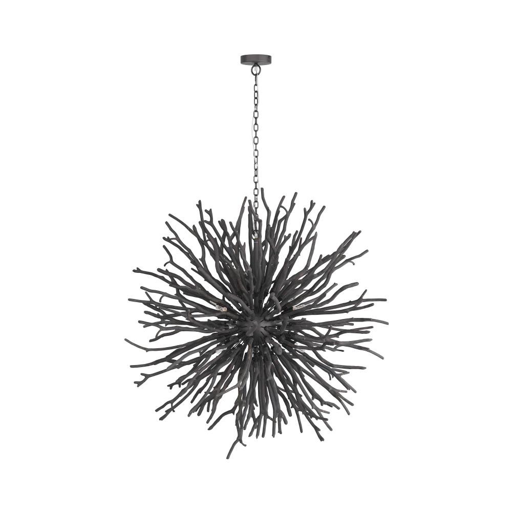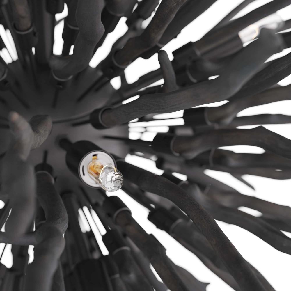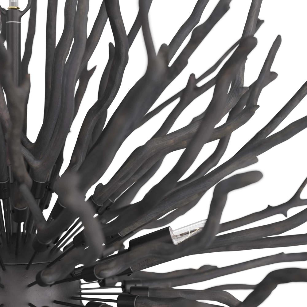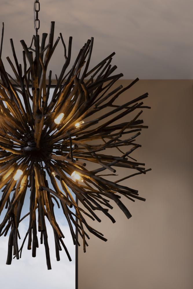 AN ORGANIC TAKE ON THE CLASSIC STARBURST DESIGN, THE FINCH CHANDELIER FEATURES DARK GRAY-WASHED BRANCHES GROWING FROM A CONCEALED BLACK IRON FRAME. EACH OF THE EIGHT LIGHTS SEEMINGLY BLEND INTO THE STRUCTURE UNTIL THEY BRING IT TO LIFE WHEN LIT, CASTING BEAUTIFUL SHADOWS ACROSS A SPACE. DUE TO THE NATURE OF THE WOOD, EACH PIECE WILL VARY IN SIZE, SHAPE, AND FINISH. THE WOODEN STICKS WILL CRACK OVER TIME; THIS IS AN INHERENT FEATURE OF SOLID WOOD OF THIS PROPORTION.
