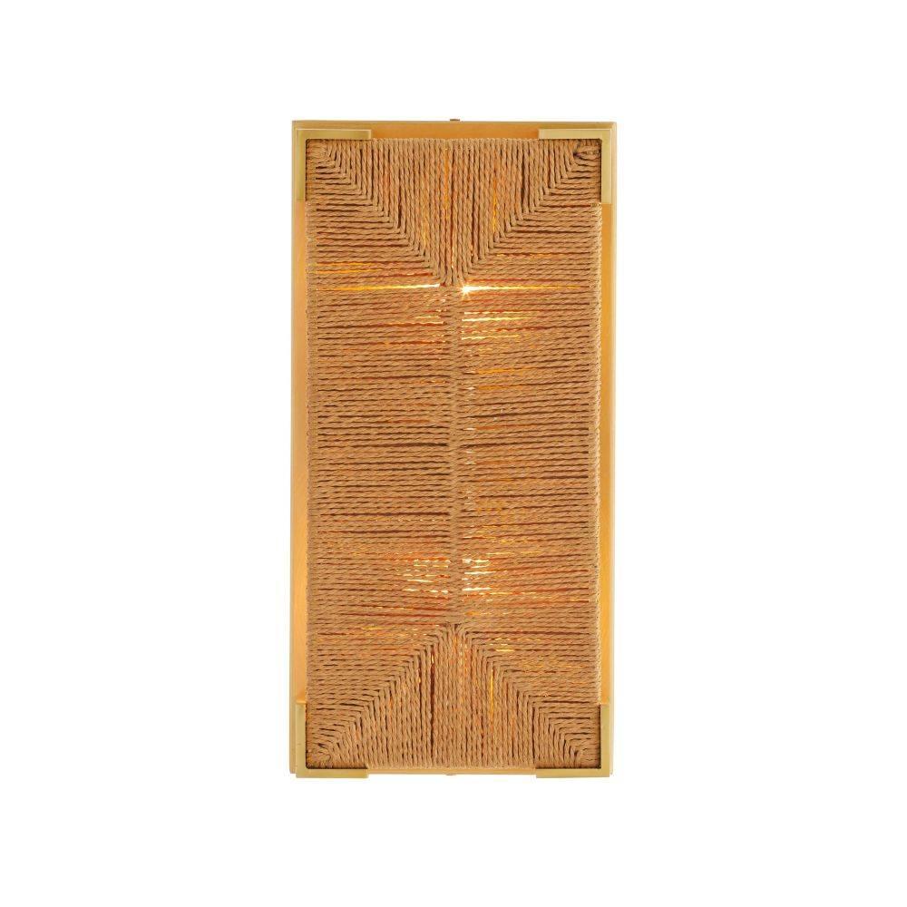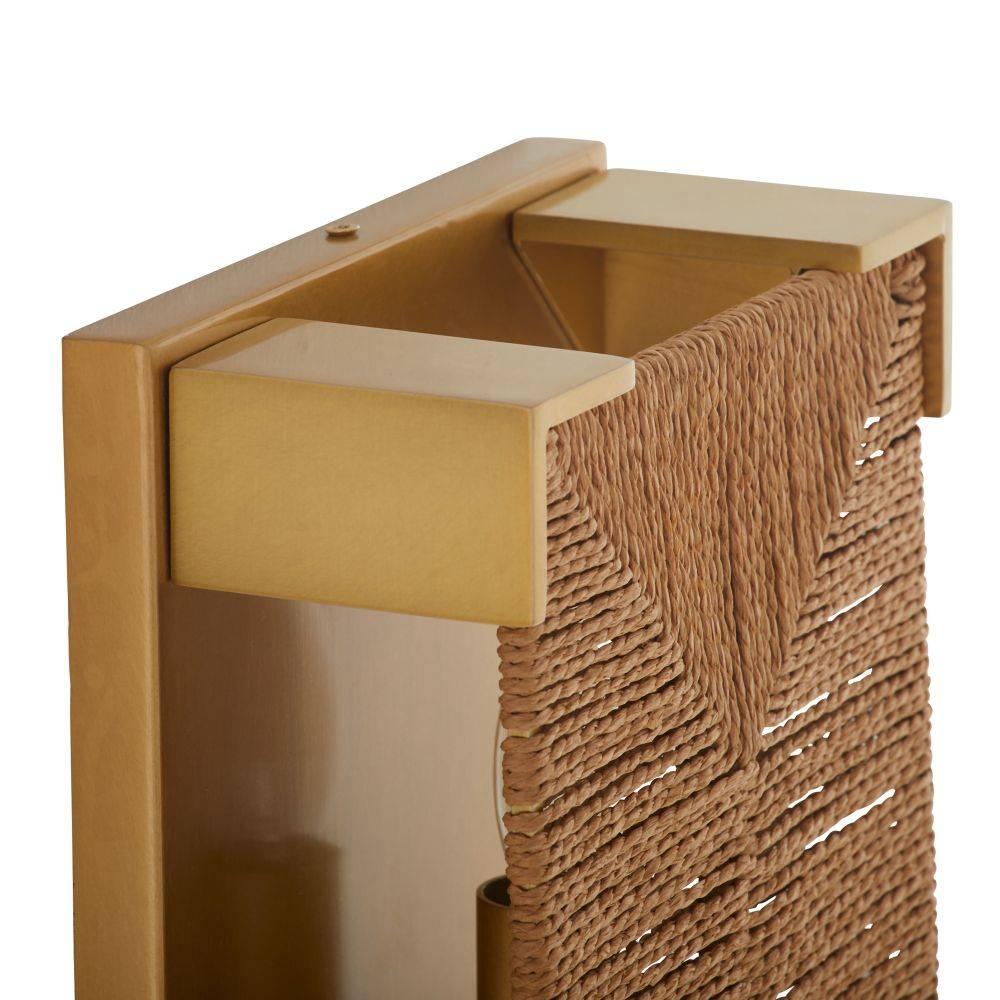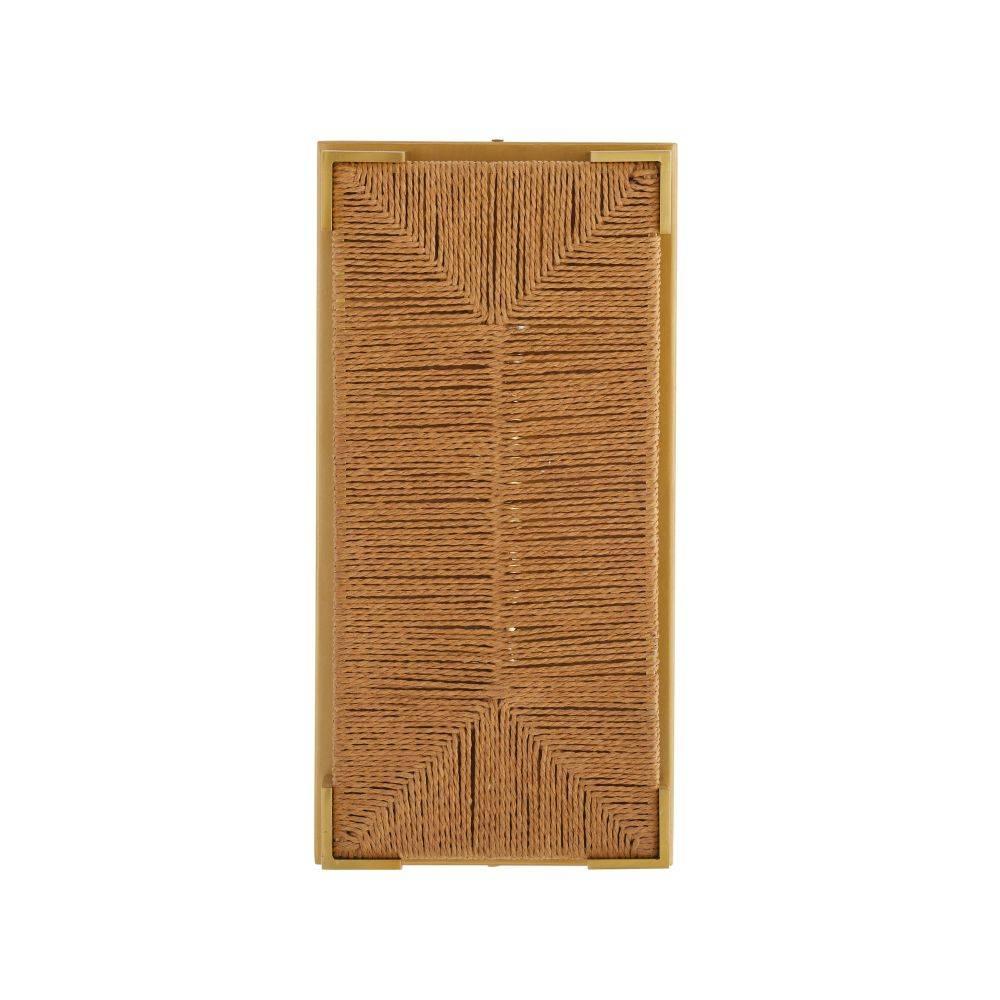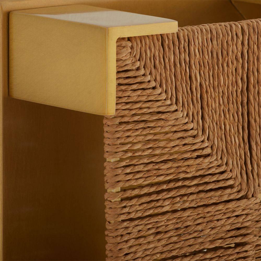 Woven in a traditional Scandinavian rush seat pattern, this natural jute rope fixture lends a natural materiality to an architectural form. Clamped in an antique brass-plated iron setting, it is a dynamic addition to a classic coastal or rustic lodge-style interior. Damp-rated, although limited covered outdoor areas may affect finish. Finish will vary.
