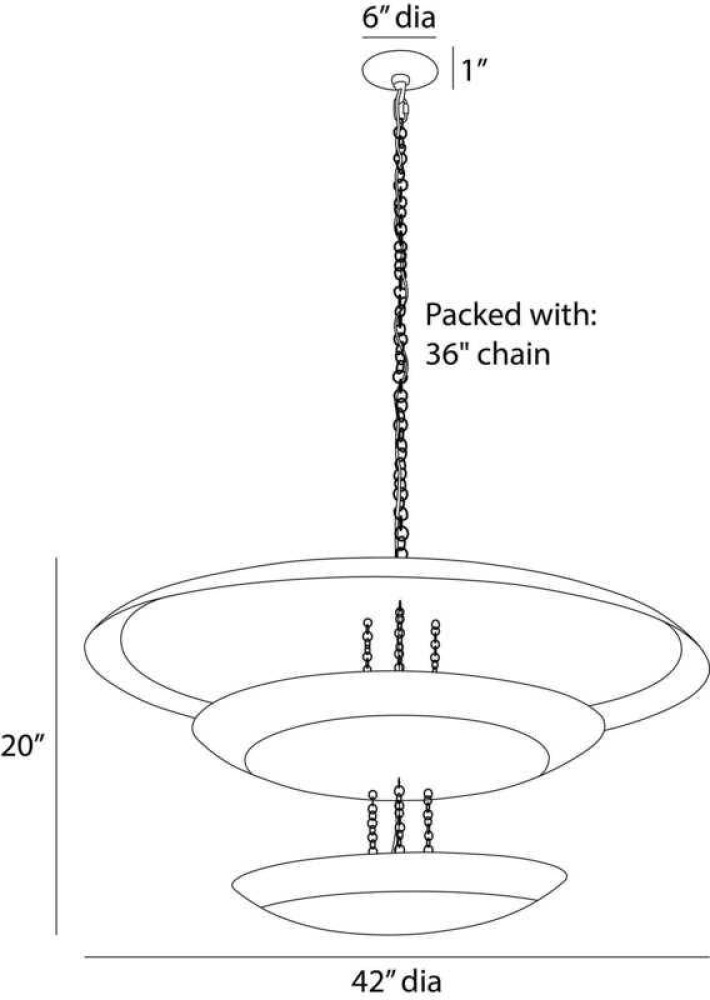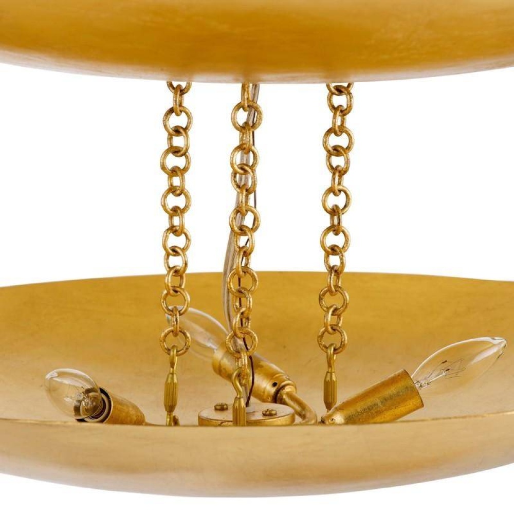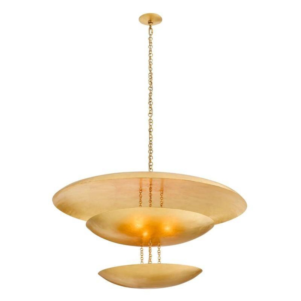 The out-of-this-world design of the Florko is supersized in a new over scaled version. Gold-leafed iron curled discs float effortlessly under the space-like dome. Both lower levels hold lights, creating a soft glow. Finish will vary.
