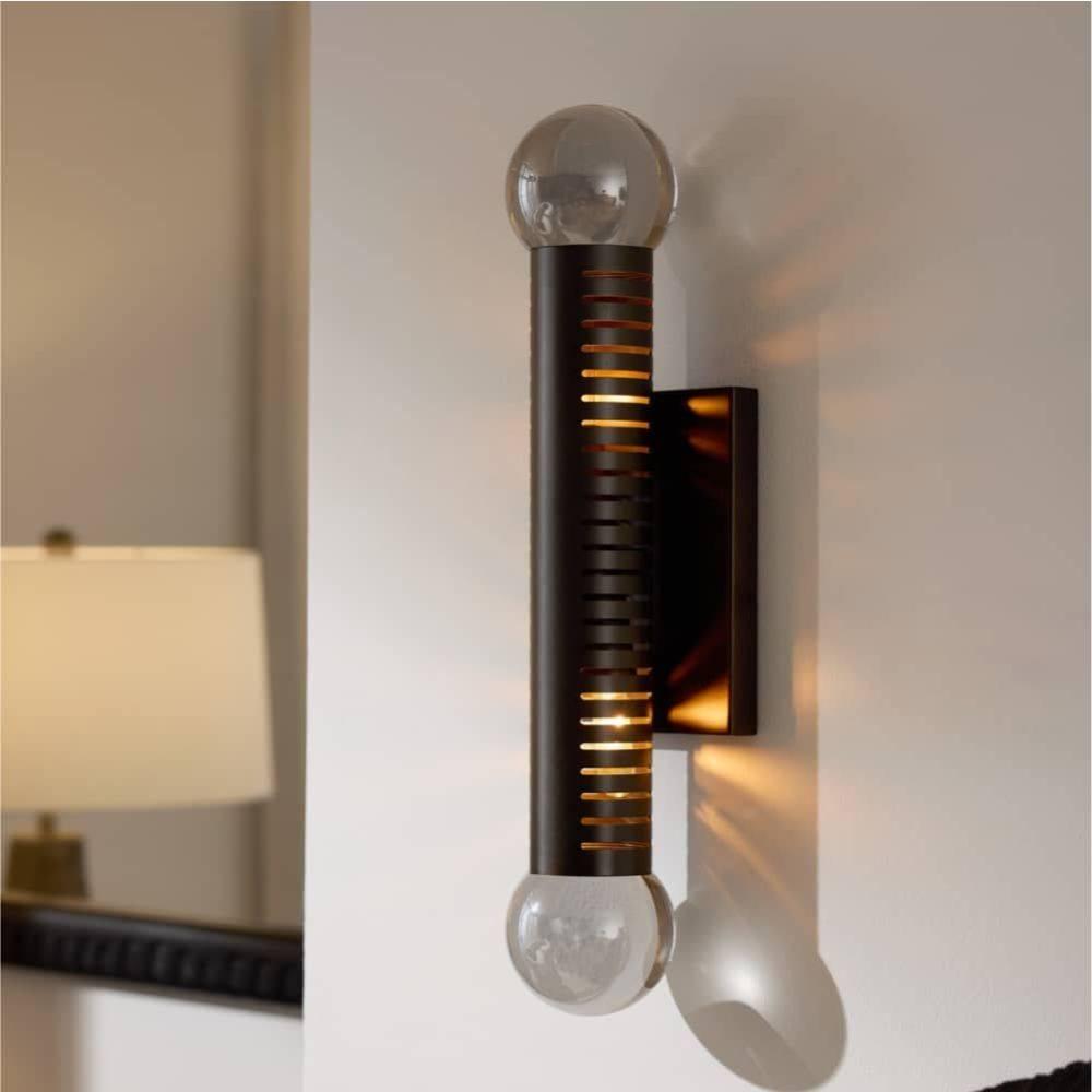 Our English bronze-plated steel sconce with a pair of smoke crystal ball has a handsome machined look that is even more eye-catching when paired or tripled. Its balance of linear and round elements lends an architectural presence to a hallway or corridor, while slotted perforations allow for an enchanting bleed of light. Damp-rated, although limited covered outdoor areas may affect finish.