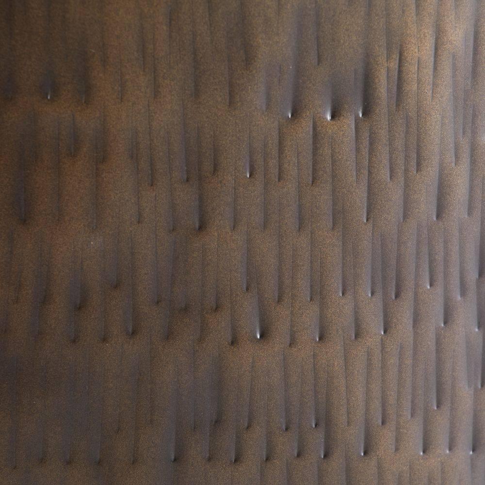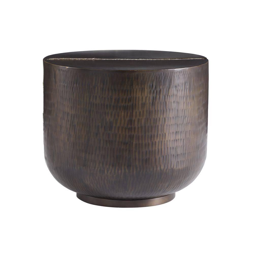 The shape of a calming and meditative singing bowl influenced our table of antique bronze finished iron. This Zen accent piece is bisected with an inset seam of gray rope for a ying-yang effect. A hammered texture, reminiscent of a traditional metal artifact, adorns the sides. Finish will vary.