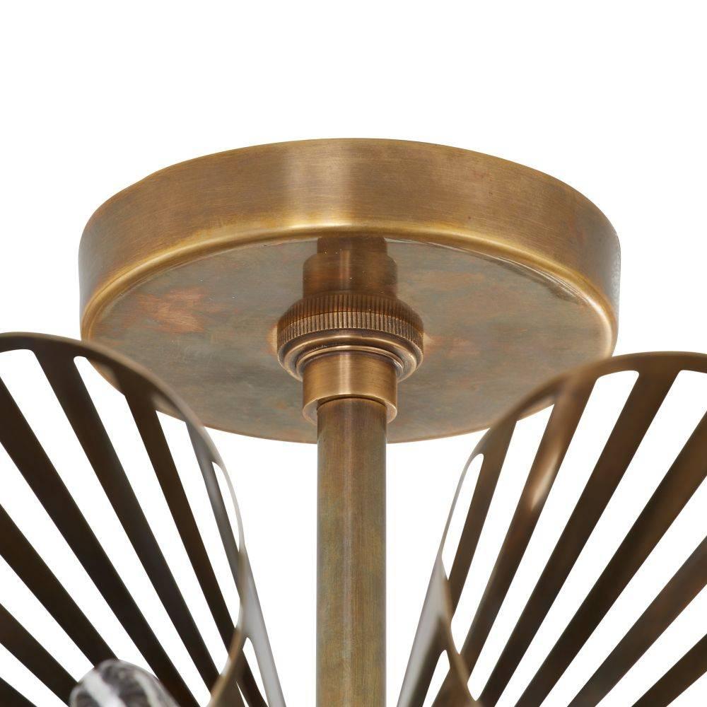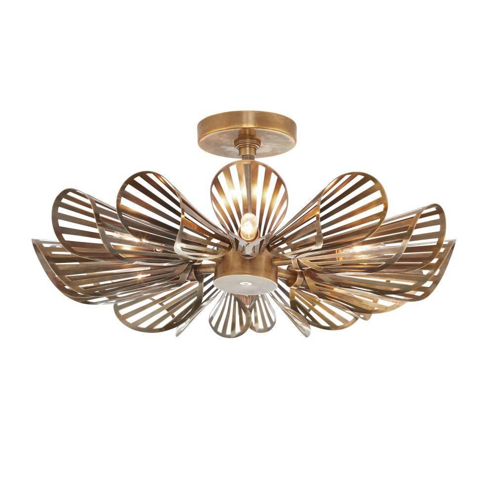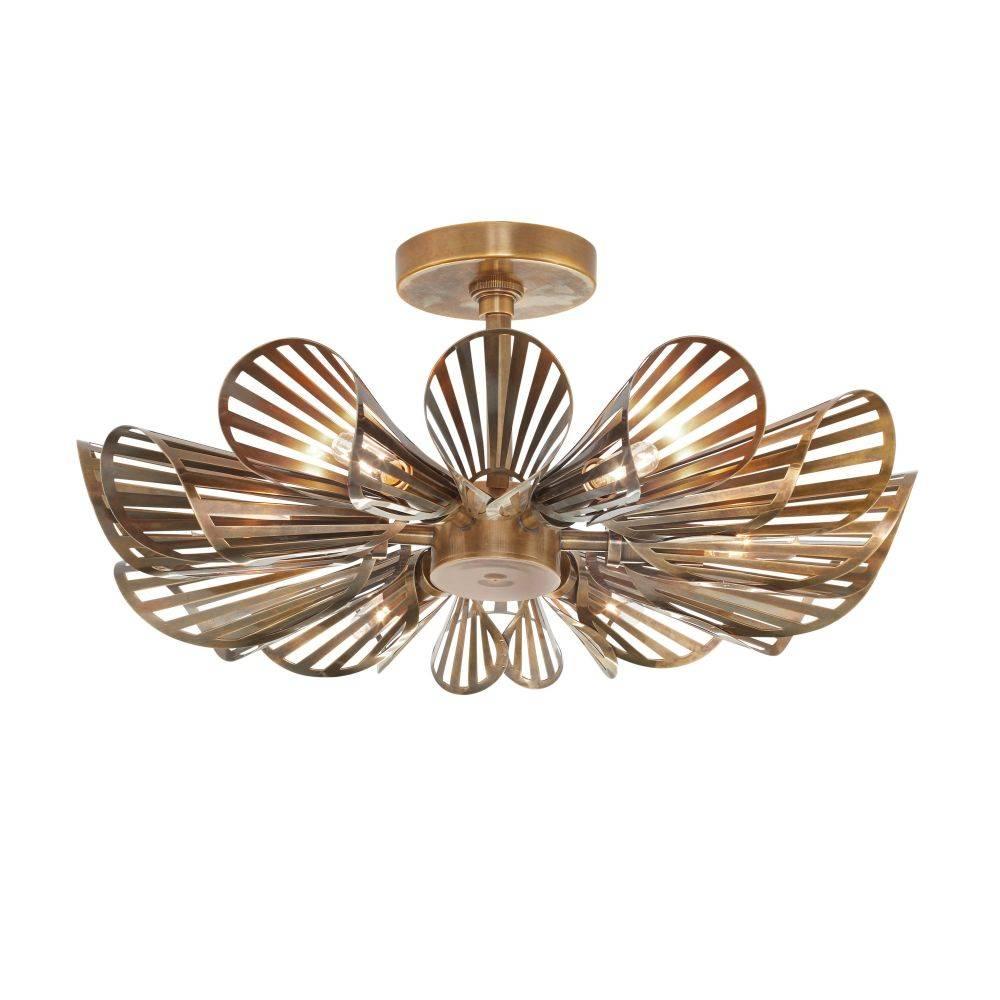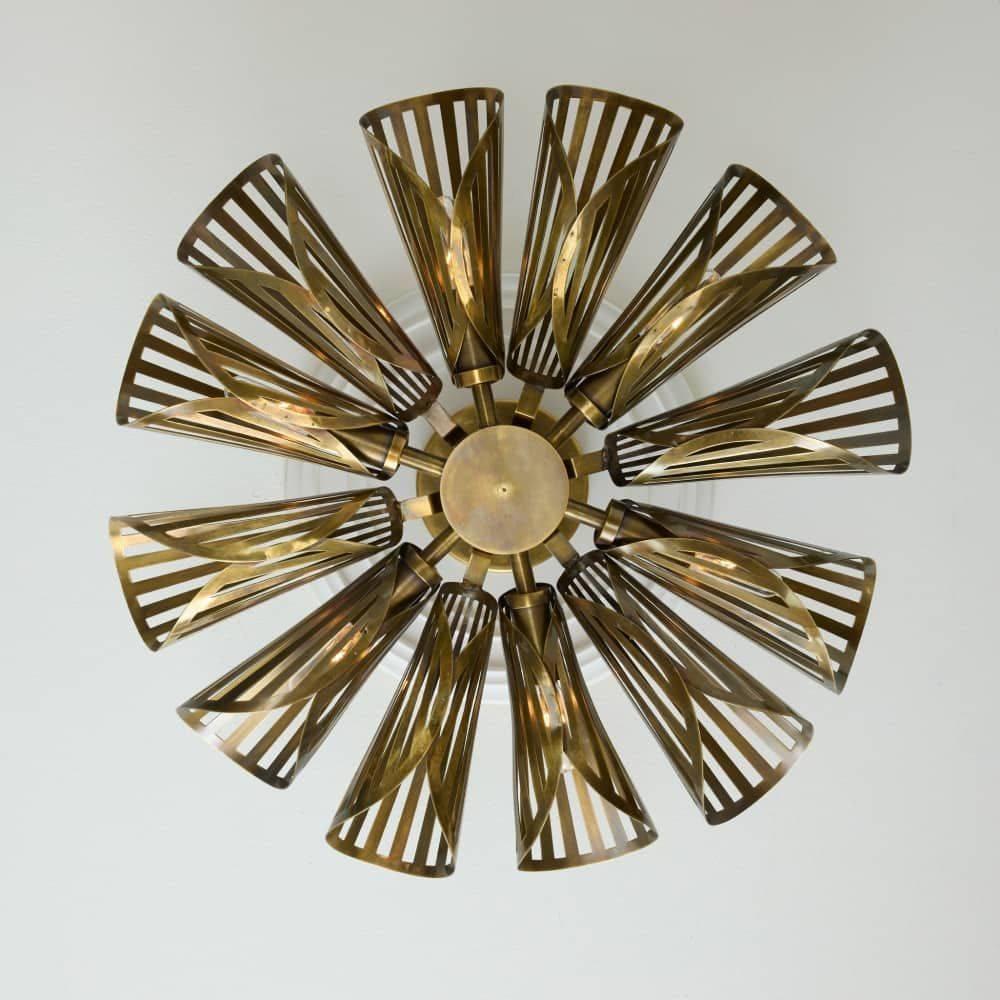 Inspired by the artisanal craft of woven wall art, each shade of our dynamic fixture is laser-cut and rolled to resemble the petals of a flower. Forged of vintage brass, this 12-light chandelier is suspended from a brass canopy. Elegant on its own, it is even more impactful when hung in multiples. Damp-rated, although limited covered outdoor areas may affect finish. Finish will vary.