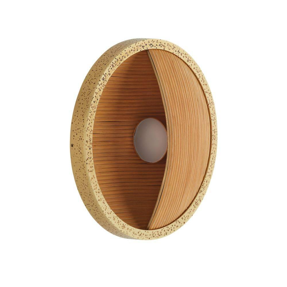 Designed to be installed vertically or horizontally for up or down lighting, an intriguing sconce embodies the yin and yang of modern design. Natural pencil rattan is suspended in an antique brass-plated hammered iron setting and distressed at the edges with the antique cow tail technique. Single integrated LED bulb. Damp-rated, although limited covered outdoor areas may affect finish. Finish will vary.