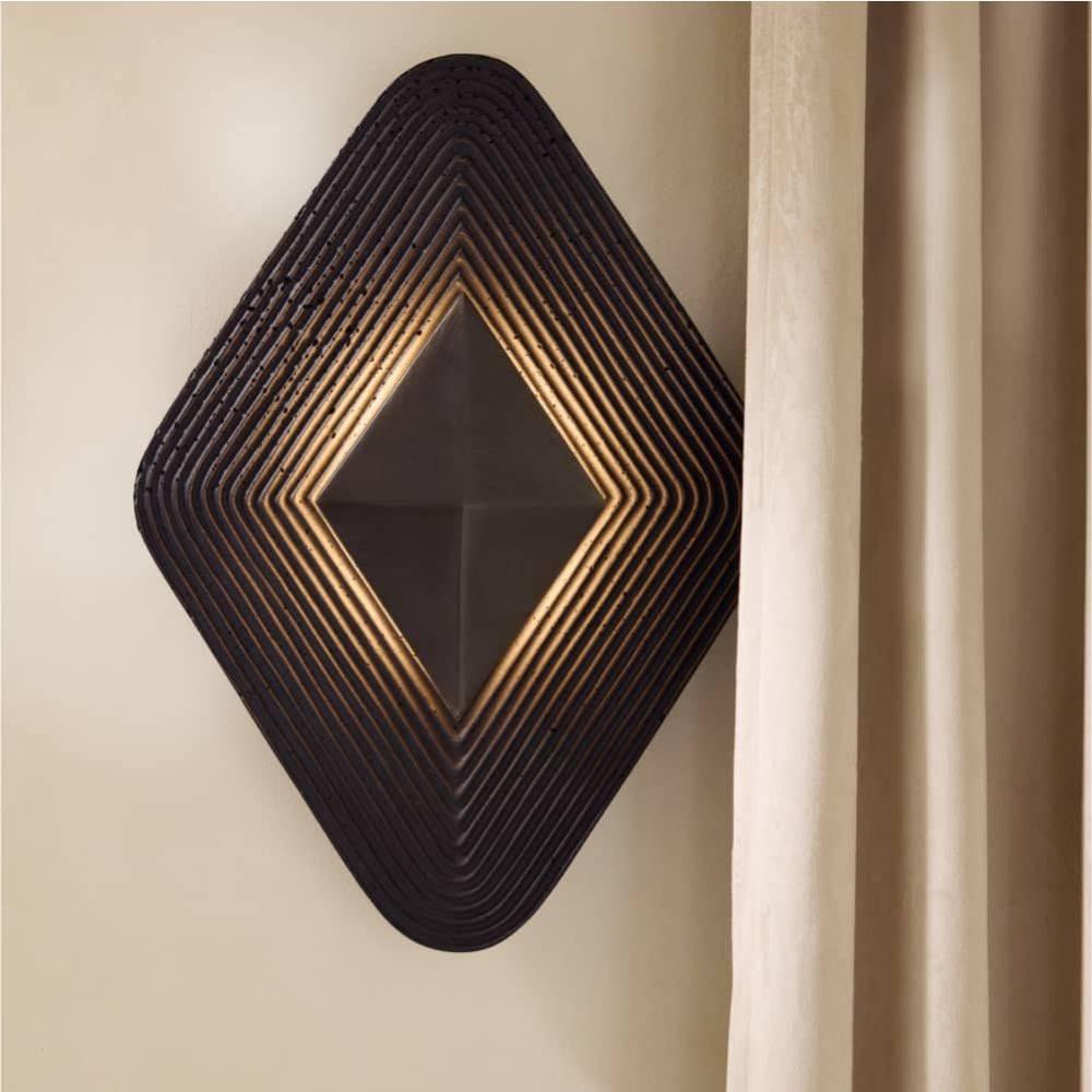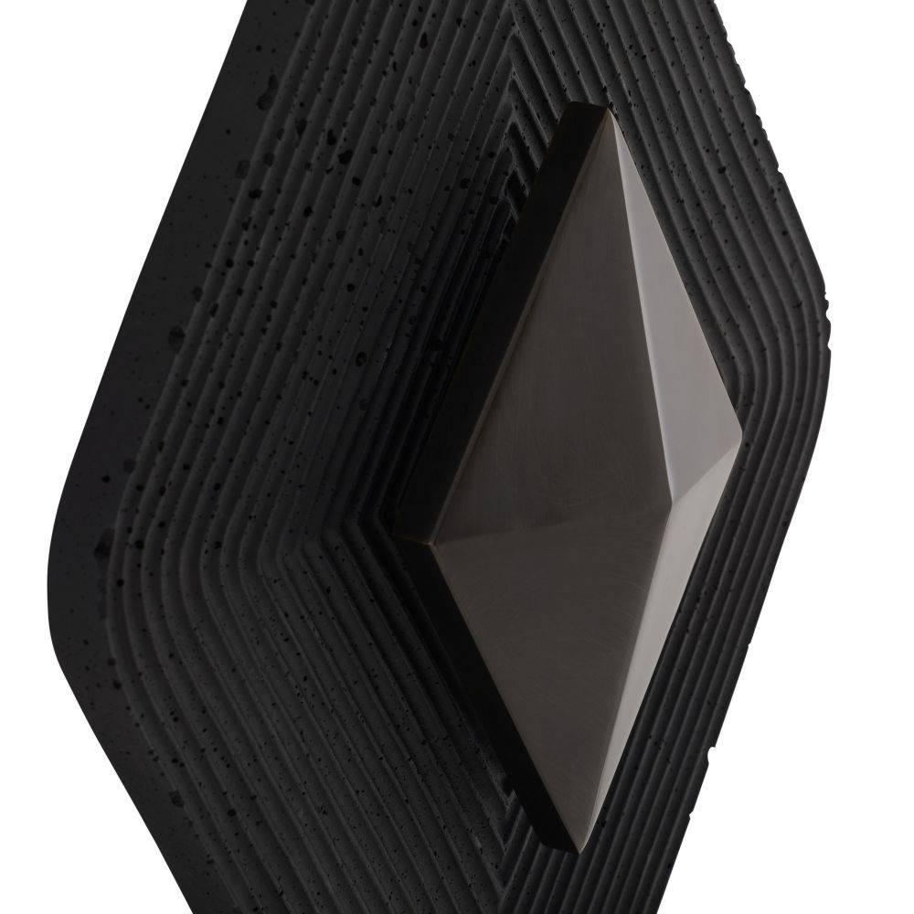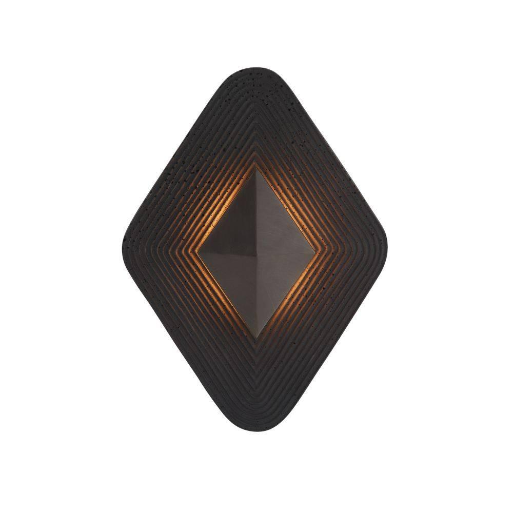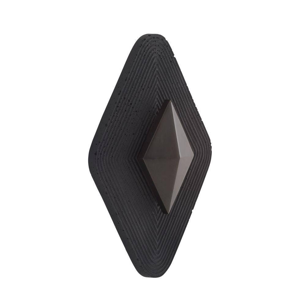 The opulent and intricate linework of Art Deco informs Gatsby's resonant form. A faceted diamond of English bronze-plated iron is suspended on a grooved backdrop of charcoal ricestone composite, allowing light to bounce off its dark surface. This integrated LED fixture has a white acrylic diffuser to soften the glow from a single bulb. Damp-rated, although limited covered outdoor areas may affect finish.