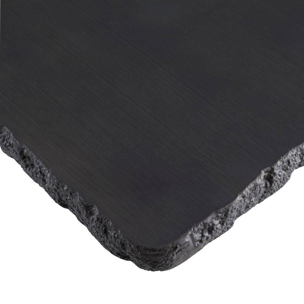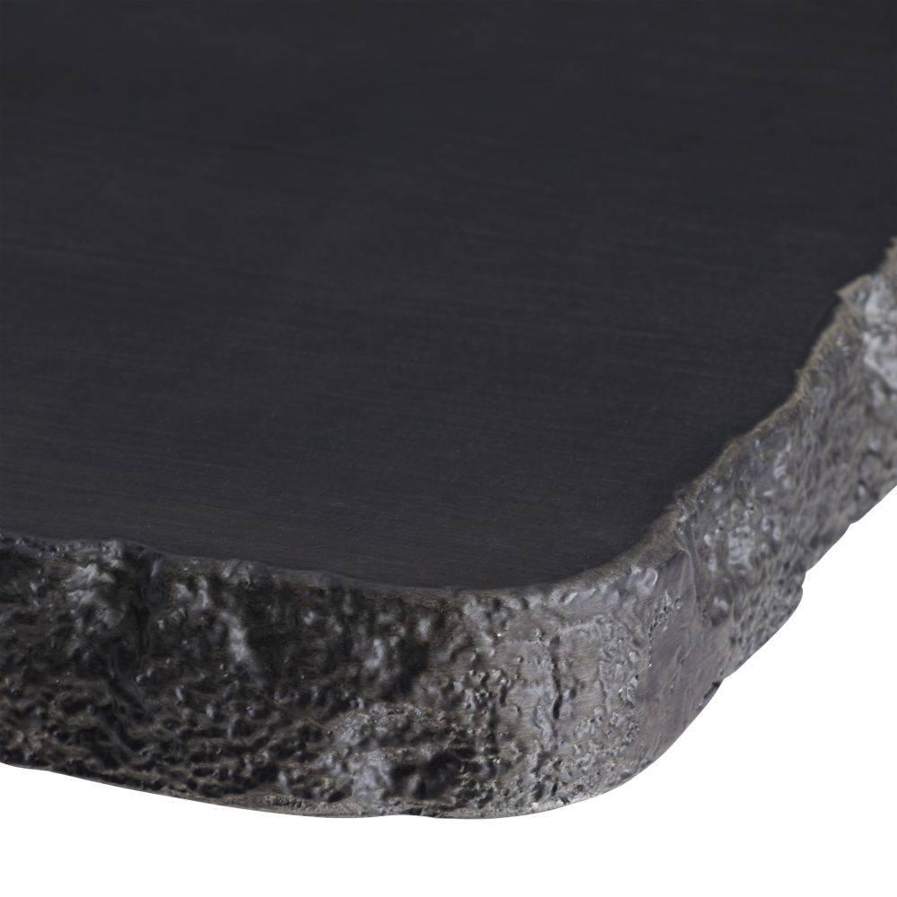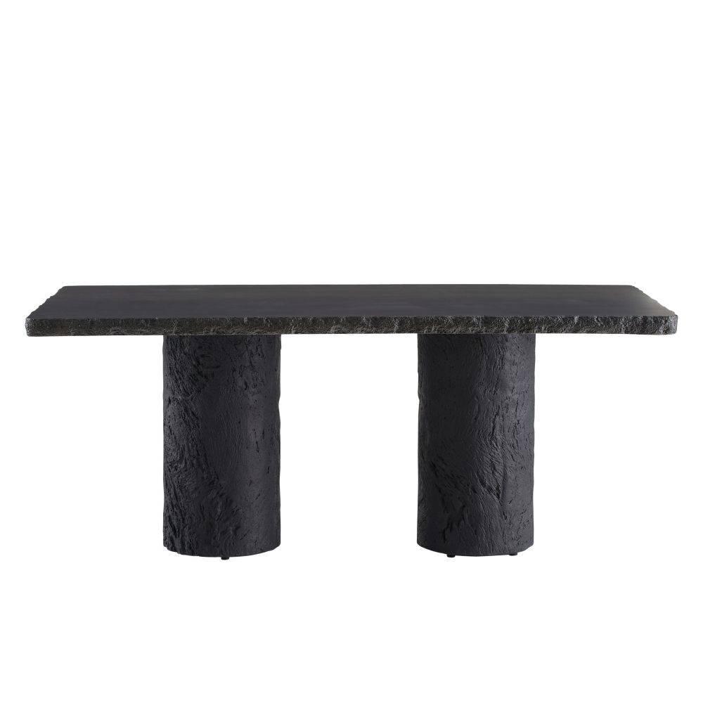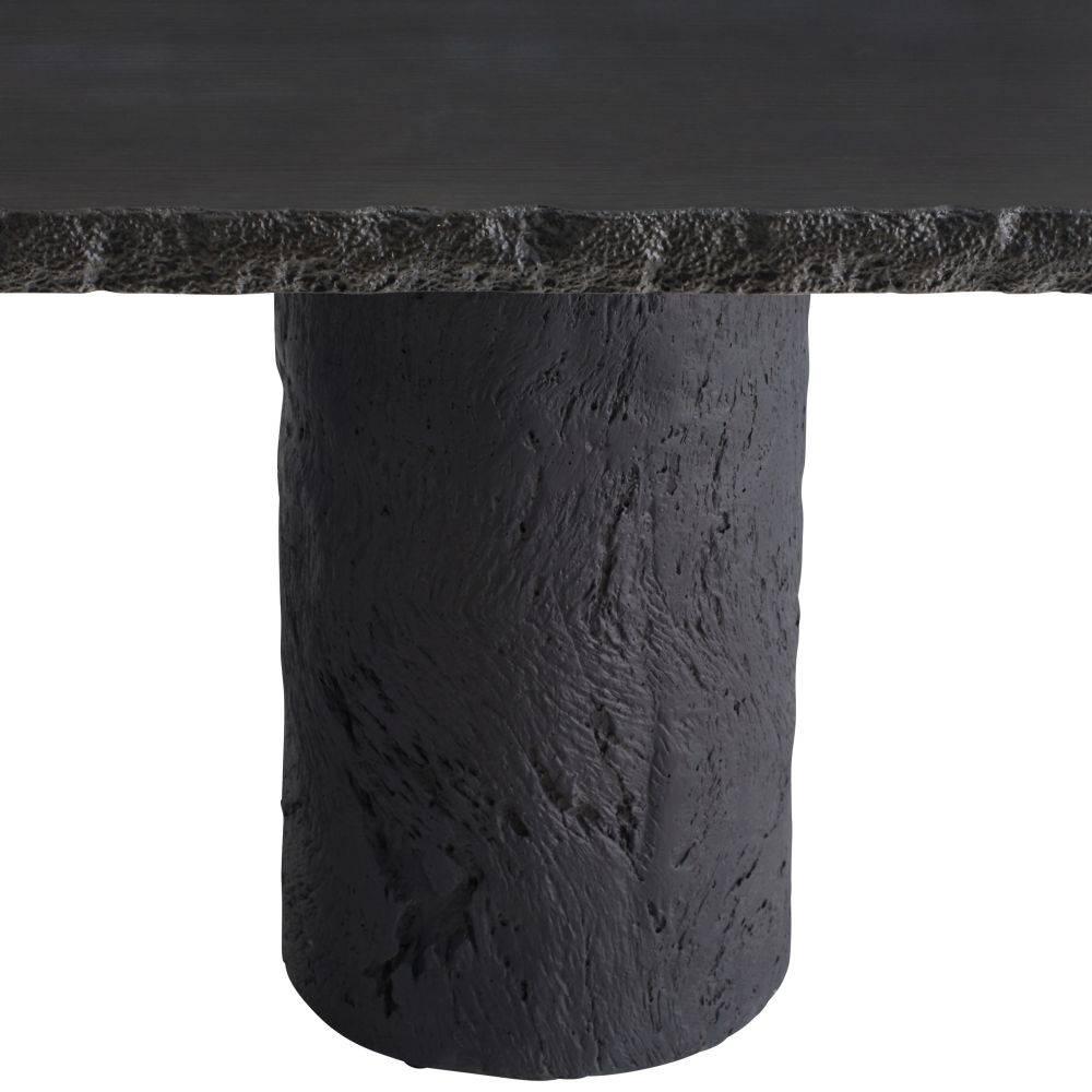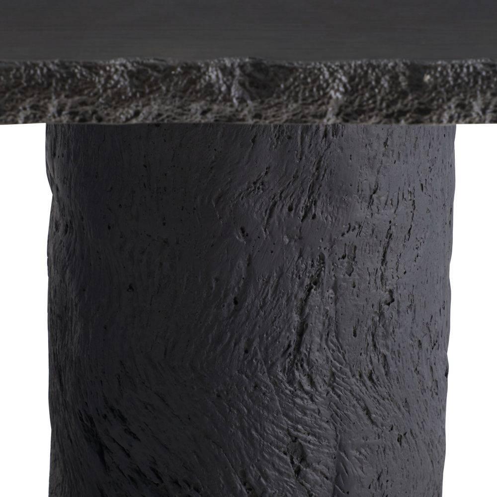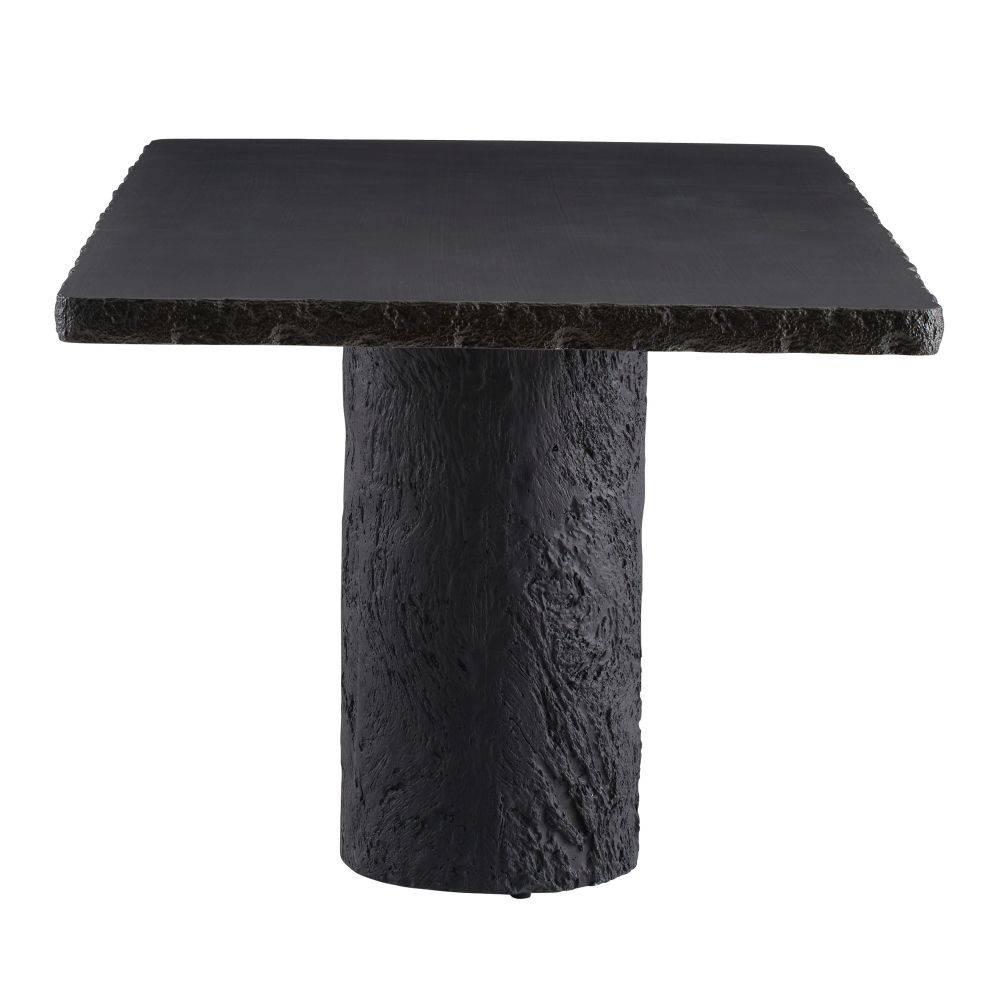 The edges and legs of this dining table were made with a faux bois texture, allowing it to blend effortlessly in harmony within any natural setting. Cast from matte carbon concrete composite, it has a hollow base for easier movement within your outdoor space. Each piece is hand-finished and unique. Finish will vary.