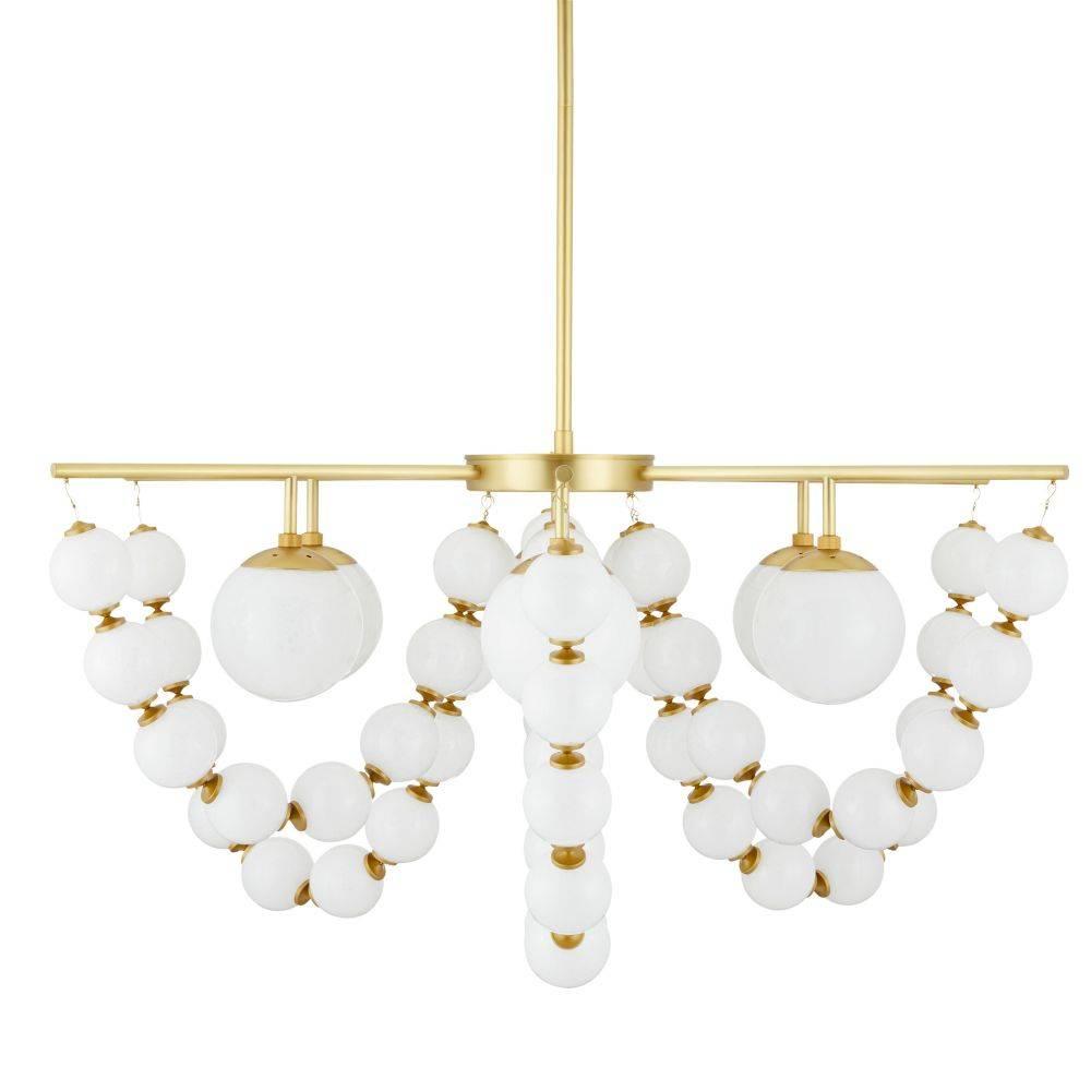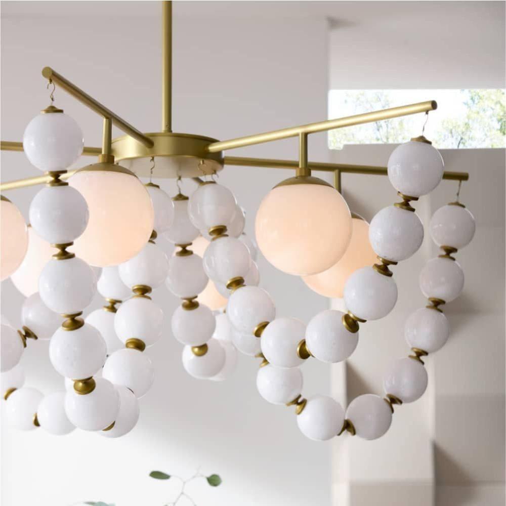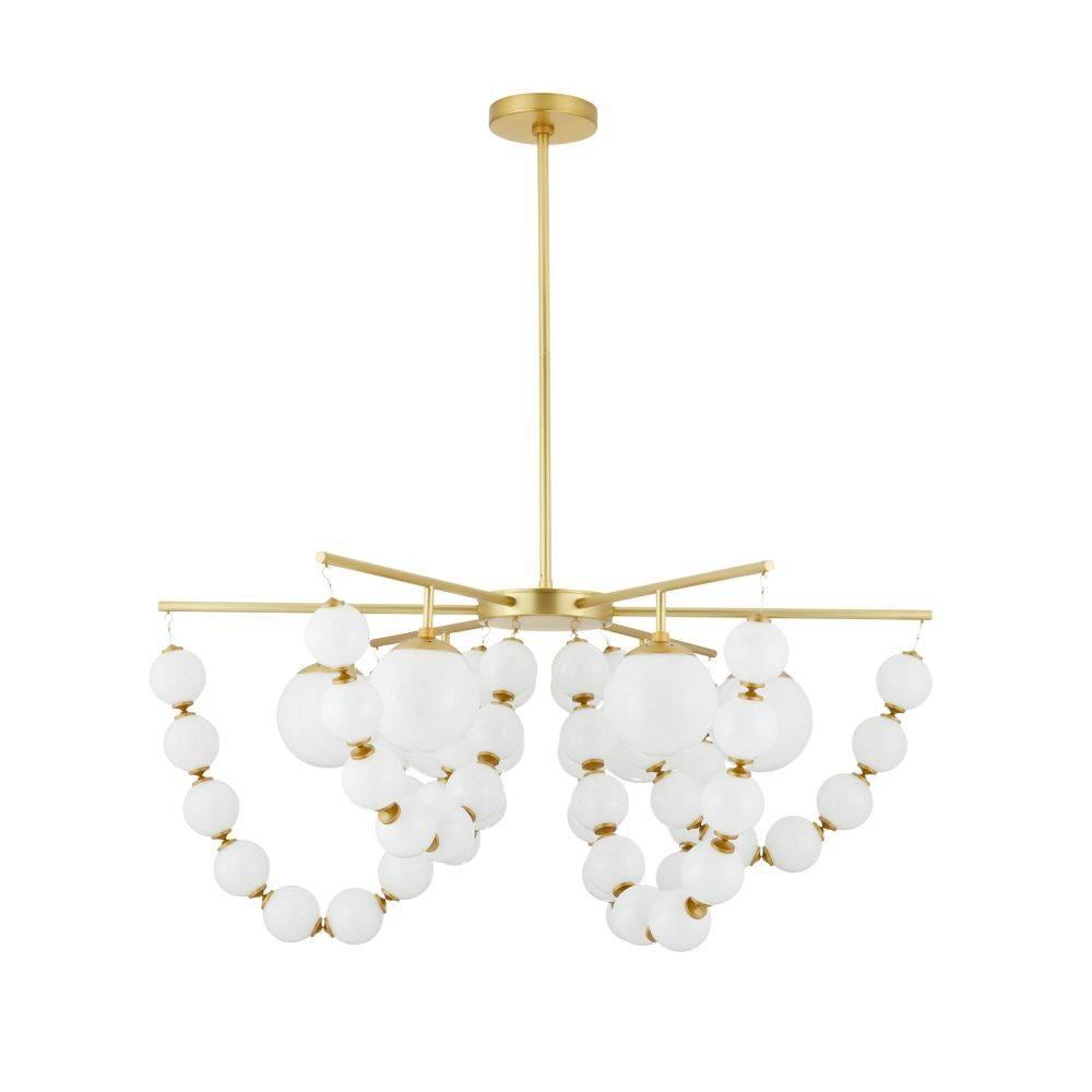 The lavishness of layered necklaces is reflected in the jewelry-inspired Genesis. Swagged and draped along a framework of antique brass-plated steel, strings of opal seedy glass baubles add a dramatic accompaniment to opal glass shades. With a framework, pipe, and canopy of antique brass-plated steel, this elegant fixture adds instant glamour wherever it is placed. Damp-rated, although limited covered outdoor areas may affect finish.