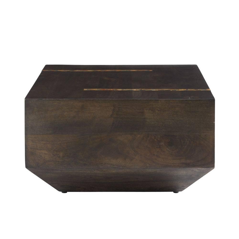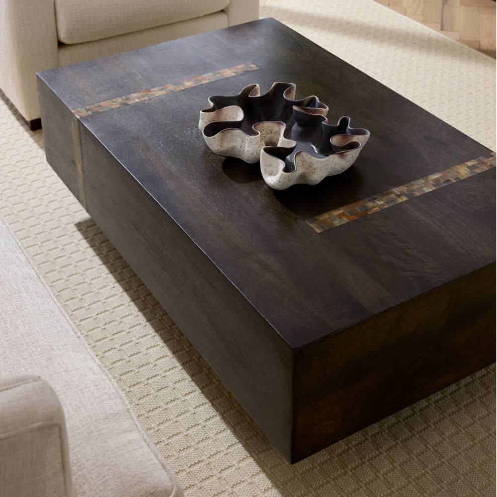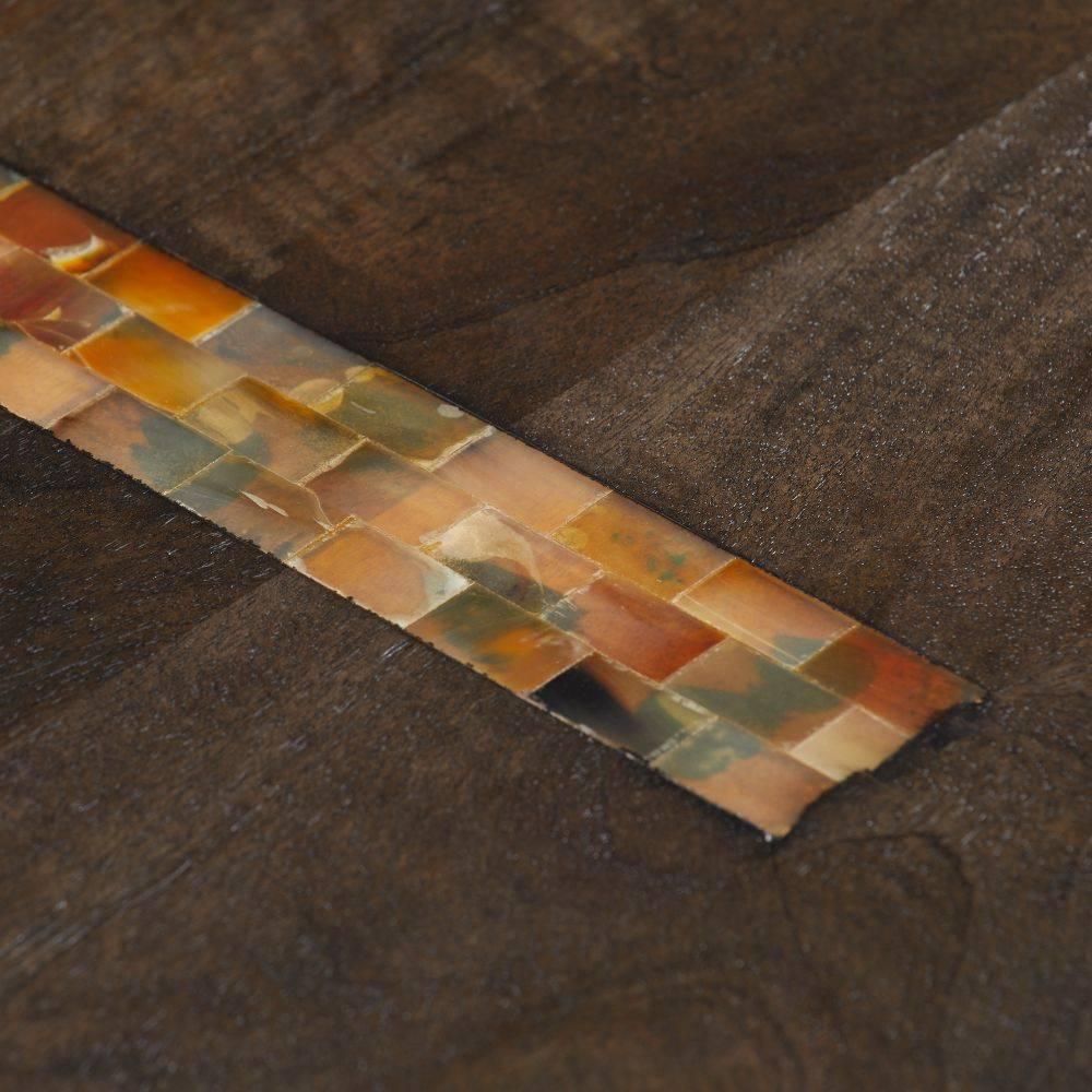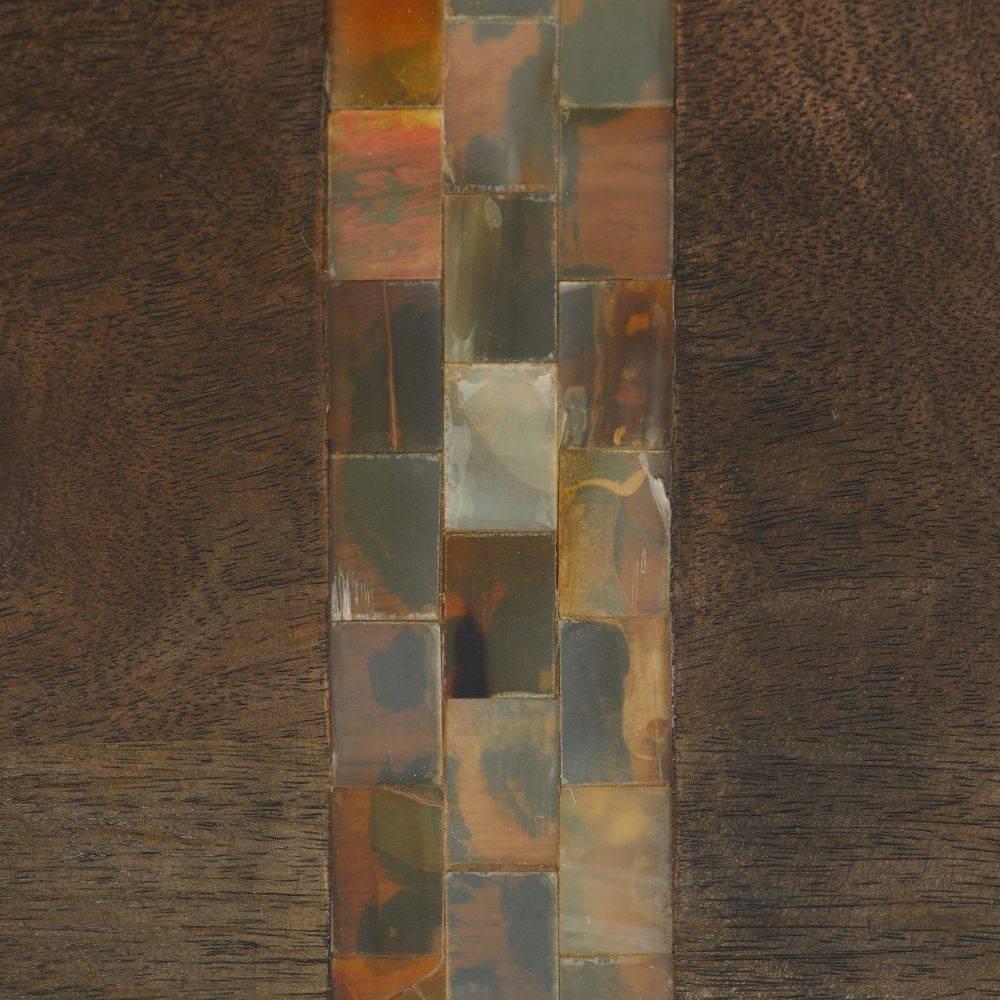 Our monolithic form of umber mango wood is inset with opposing racing stripes of natural faux horn resin. Cascading in waterfalls down the sides, these impactful details give a cantilevered effect to the split veneer surface, adding to the natural beauty. Finish will vary.