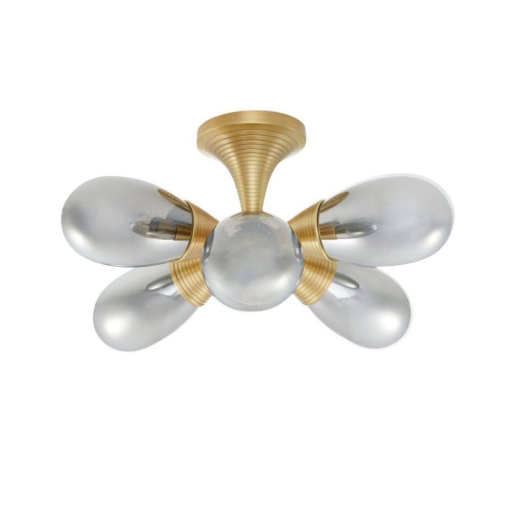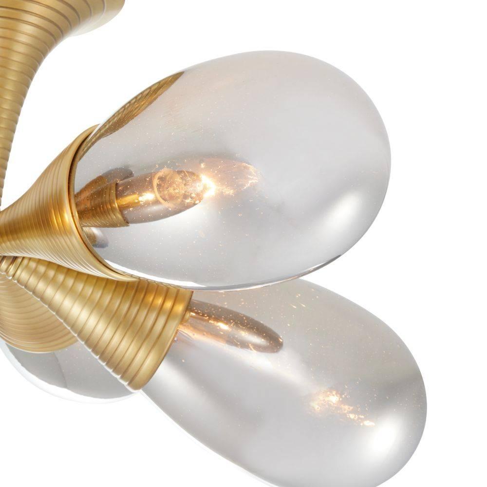 Like meteors drifting through space, six handblown fixtures of smoke luster seedy glass disperse light across the room. This celestial fixture is suspended from a trumpet-shaped canopy of antique brass plated iron, ribbed for visual interest. Damp-rated, although limited covered outdoor areas may affect finish.